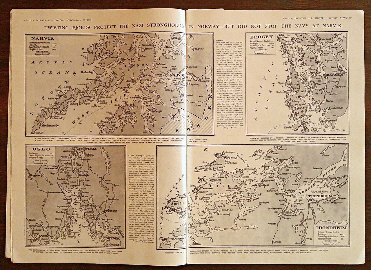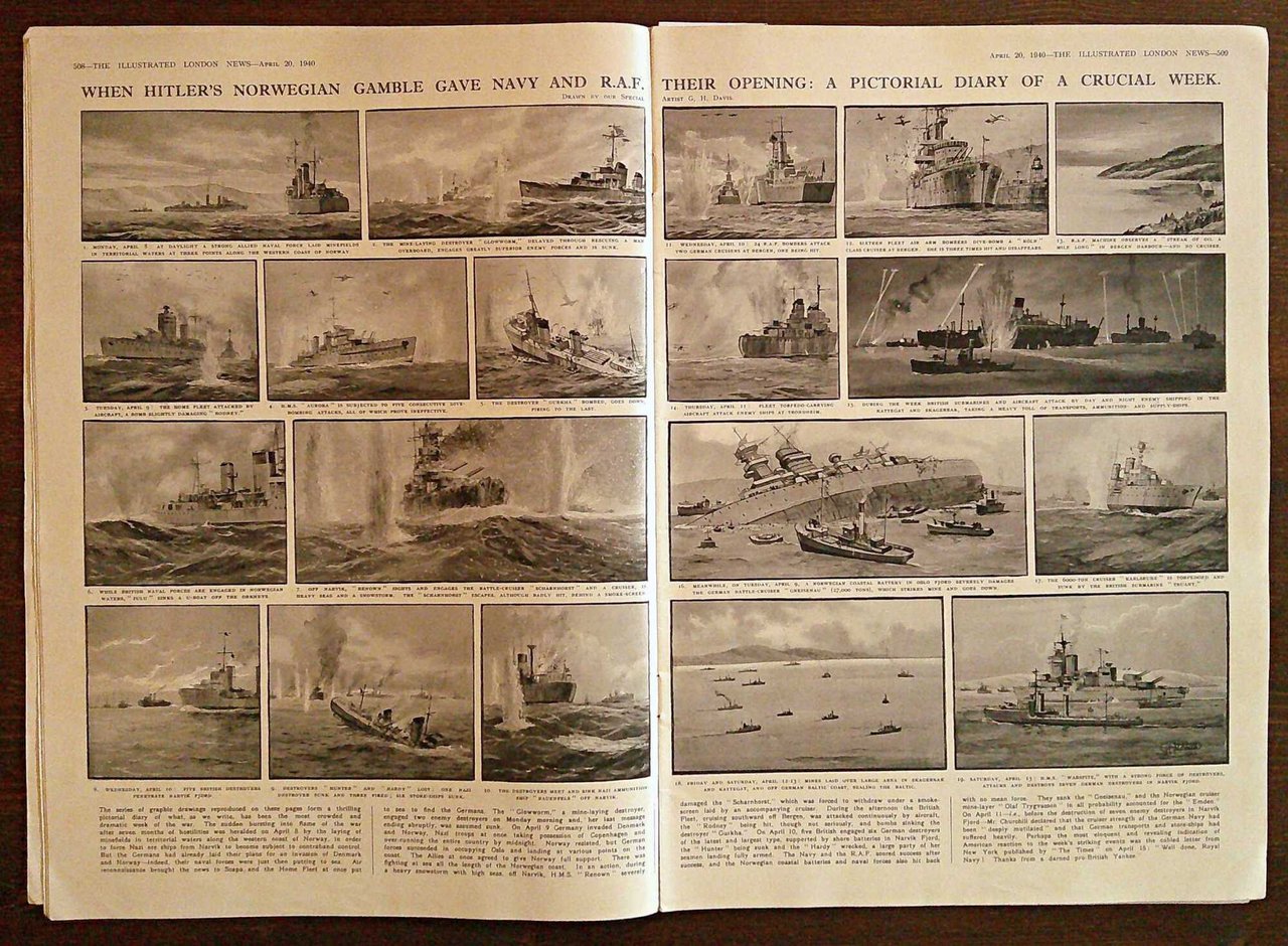 The Illustrated London News. 20 Aprile 1940. The war completely and exclusively illustrated. N.5270- Volume 196. Illustrazioni fotografiche in b/n n.t., di guerra e di attualità, e belle pubblicità del tempo. Ed. The Illustrated London News and Sketch Ltd. - London, 1940. Brossura editoriale con lievi imperfezioni al dorso. 26x37; pp.501-540. Buonissimo stato. , Molto buono (Very Good)