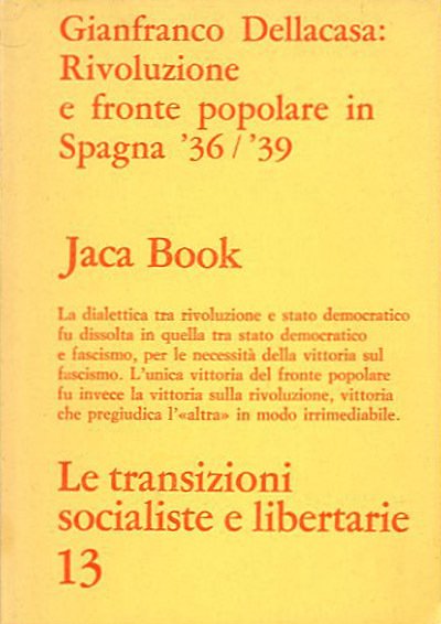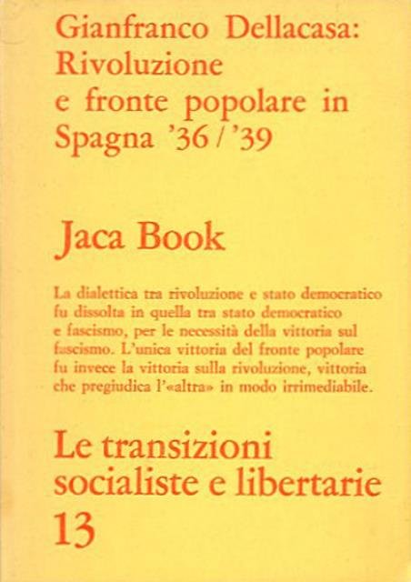 192 p. ; 17 x 12 cm. Le transizioni socialiste e libertarie. La tesi di questa ricerca sulla Guerra civile spagnola (1936-39) sostiene che la dialettica tra rivoluzione e stato democratico si dissolse in quella tra stato democratico e fascismo, per le necessità della vittoria sul fascismo. L'unica vittoria del fronte popolare fu invece la vittoria sulla rivoluzione, vittoria che pregiudicò l'«altra» in modo irrimediabile. Brossura editoriale, coperta in cartoncino flessibile colorato (giallo) con titolo impresso in rosso al piatto e al dorso. Codice libreria 2952.