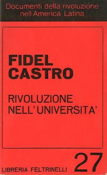 50 p. ; 18 x 11 cm. Documenti della rivoluzione nell'America Latina, 27. 13 marzo 1969: dodici anni dopo l'assalto degli studenti universitari dell'Avana al Palazzo del tiranno Batista, Fidel Castro, affronta in un discorso il problema della trasformazione del sistema di studi superiori nel quadro di una rivoluzione matura, che già sta cambiando l'uomo. Traduzione dallo spagnolo di Saverio Tutino. Brossura editoriale, coperta in cartoncino flessibile colorato (nero/rosso). Codice libreria 6438.