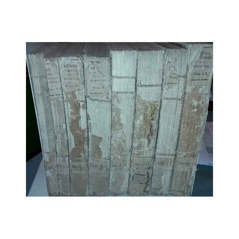 8 tomi. In 8, pp. 2.334 complessive Volumi privi di copertina, intonsi,in carta vergata, in barbe. Diffuse gore, bruniture e fioriture, gore al III tomo. Ampia e documenta narrazione, distribuita in 20 libri, che va dalle guerre dei Cimbri (648 a.C.), alla fine delle guerre napoleoniche. Luogo di pubblicazione FirenzeEditore Guglielmo PiattiAnno pubblicazione 1804Materia/Argomento Storia, Germania ***Due to bureaucratic reasons, books dated over 70 years old cannot be immediately exported, please contact us before placing the order.***