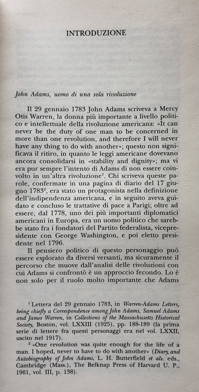 Il controllo del potere attraverso il potere è uno dei temi classici della storia del pensiero politico. Le soluzioni elaborate negli Stati Uniti possiedono una notevole originalità, e non solo a motivo dell'assetto federale di quel paese. La teoria dei «checks and balances», infatti, nasce a un altro livello, nel senso che si esplicita nell'insieme di freni e contrappesi che vengono posti fra gli organi supremi dello stato federale, così come fra quelli del singolo stato membro. Il principale teorico di questo filone è John Adams, che pro-pugna la costruzione di meccanismi di controllo sulle fazioni, l'autonomia della Corte suprema, e soprattutto un legislativo bicamerale e tripartito, in cui cioè anche il presidente abbia col veto un ruolo (solo interdittivo) nella formazione delle leggi, per arginare quelle sorrette da logiche di parte o demagogiche. Leader bostoniano della rivoluzione e ispiratore diretto di molte costituzioni delle tredici ex colonie, capo della diplomazia americana in Europa assieme a Jefferson, esponente moderato del partito federalista e secondo presidente, Adams viene qui proposto nella sua dimensione di teorico delle costituzioni e degli equilibri nelle società umane, di osservatore delle grandi rivoluzioni fra '700 e '800, di avversario di un'idea di progresso astorica e radicale, interrogandosi egli sulle passioni dell'uomo e sulle costanti della storia. Temi fecondi ancor oggi, proposti da quella che è la prima raccolta in Italia dei principali scritti di questo personaggio.