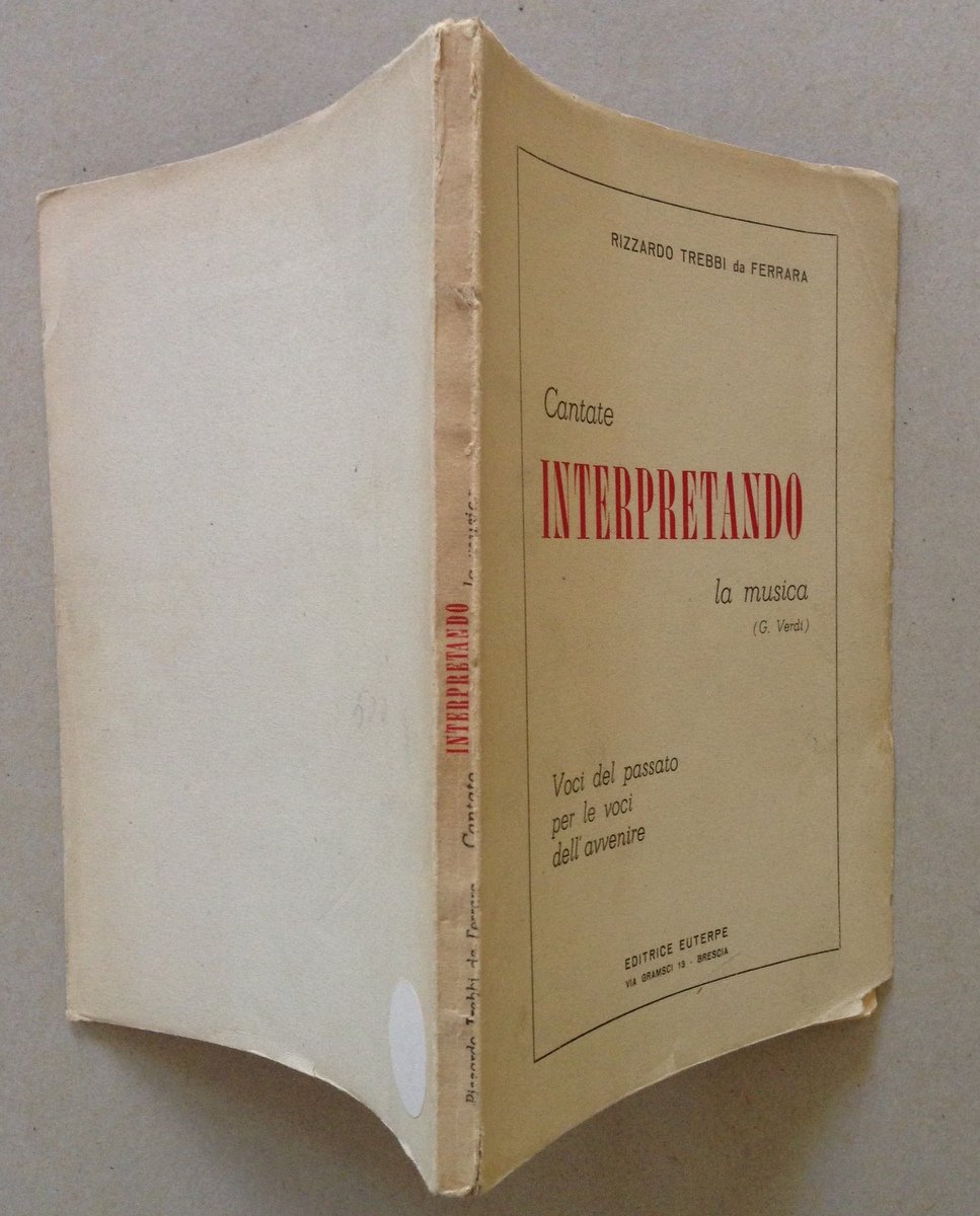 Rizzardo Trebbi da Ferrara, Cantate interpretando la musica (G. Verdi) Editrice Euterpe, Brescia 1955, cm. 20.5x14.5, pp. 95; voci del passato per le voci dell'avvenire; br. ed. Condizioni di conservazione Esemplare in buono stato con leggere tracce d'uso; brossura editoriale con minime pieghette e strappetti agli angoli e al dorso; minima mancanza all'angolo inferiore brossura anteriore; interni leggermente ingialliti. SETT127.L12559 MT