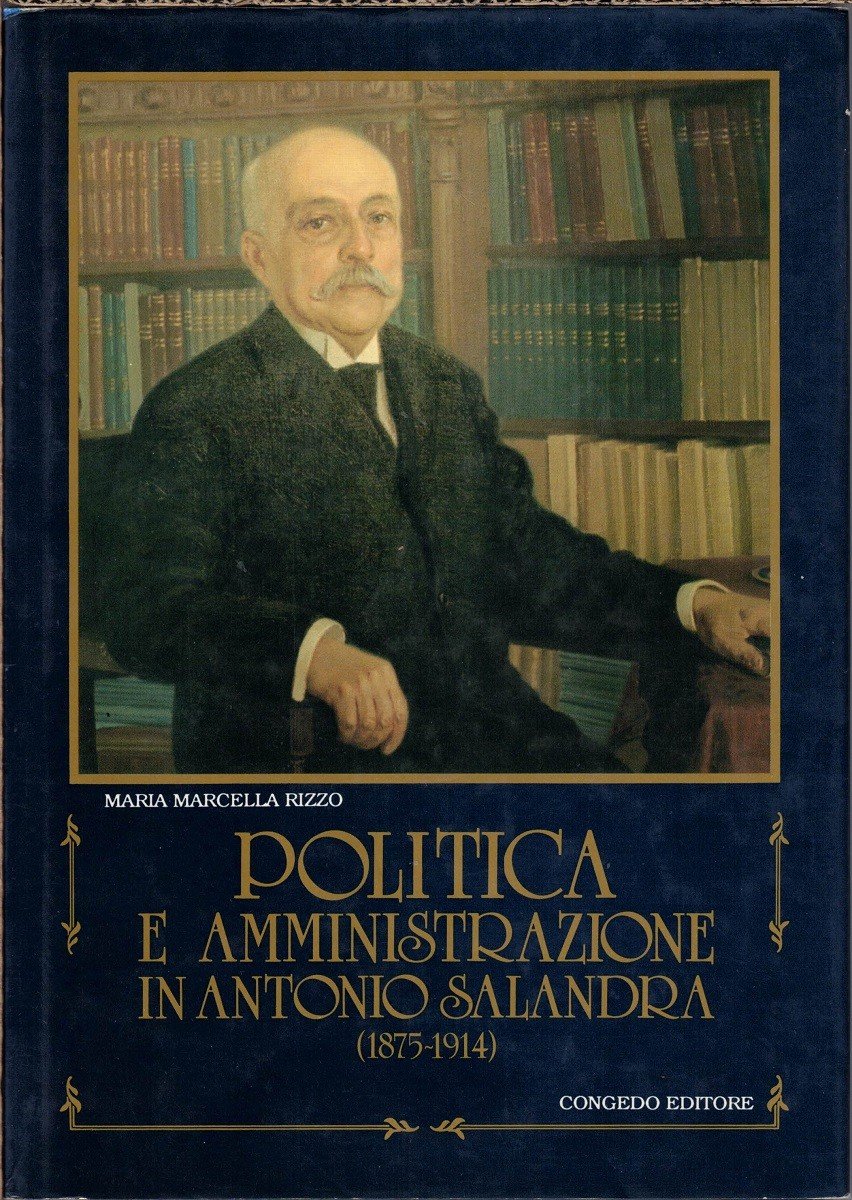 Maria Marcella Rizzo, Politica e amministrazione in Antonio Salandra. 1875-1914, Congedo Editore, Galatina 1989, pp. 278, cm 25, cart. ed. con titoli al dorso, ill. col. al piatto e sovraccoperta. Università degli Studi di Lecce. Pubblicazioni del Dipartimento di studi storici dal Medioevo all’Età Contemporanea, vol. 11. Collana Saggi e ricerche, vol. 10. Indice: Introduzione – La formazione culturale e politica. 1875-1885 (Gli studi a Napoli – La collaborazione al Giornale Napoletano e le rassegne sui socialisti della cattedra – La questione sociale in Italia e il dissenso con Sonnino – I corpi locali e il problema della giustizia nell’amministrazione – La crisi del movimento conservatore nel saggio Il Divorzio in Italia – La questione agricola e la rappresentanza politica degli interessi della terra – Strutture associative e conoscenze scientifiche per il superamento della crisi agricola – La proposta di un’Associazione di quotisti per risollevare le sorti della piccola e media proprietà) – Dall’ingresso in Parlamento agli incarichi governativi negli ultimi ministeri Crispi. 1886-1896 (La sua prima contrastata elezione a deputato – L’intesa programmatica con Crispi nello scritto Camera e Ministero – L’aumento della tariffa doganale sul grano: un atto di giustizia per gli interessati nella terra – Riforma degli enti locali e introduzione del giudizio amministrativo: due provvedimenti necessari per garantire il governo legale – In difesa della supremazia del diritto sulla politica: l’autorizzazione a procedere contro Andrea Costa – La restaurazione economica e finanziaria – Il rapporto con la base elettorale) – La partecipazione al governo Pelloux e l’elaborazione di una linea alternativa al giolittismo. 1899-1914 (Da Crispi a Pelloux: l’incarico di ministro dell’Agricoltura – Il fallimento di un piano: la vicenda parlamentare dei provvedimenti politici – Il rilancio di un largo partito conservatore e la fondazione del Giornale d’Italia – La mozione sulla questione meridionale – La difesa di una legge benefica per proprietari e contadini – Una tematica per rilanciare il liberalismo di destra: divorzio, insegnamento religioso nella scuola, rapporto tra diritto e politica – Il difficile cammino del secondo ministero Sonnino e il tradimento di Luzzati – Dall’opposizione al monopolio delle assicurazioni sulla vita al discorso dell’annunciazione) – Indice dei nomi. Leggere tracce d’uso, qualche sporadica sottolineatura a lapis, per il resto buon esemplare.