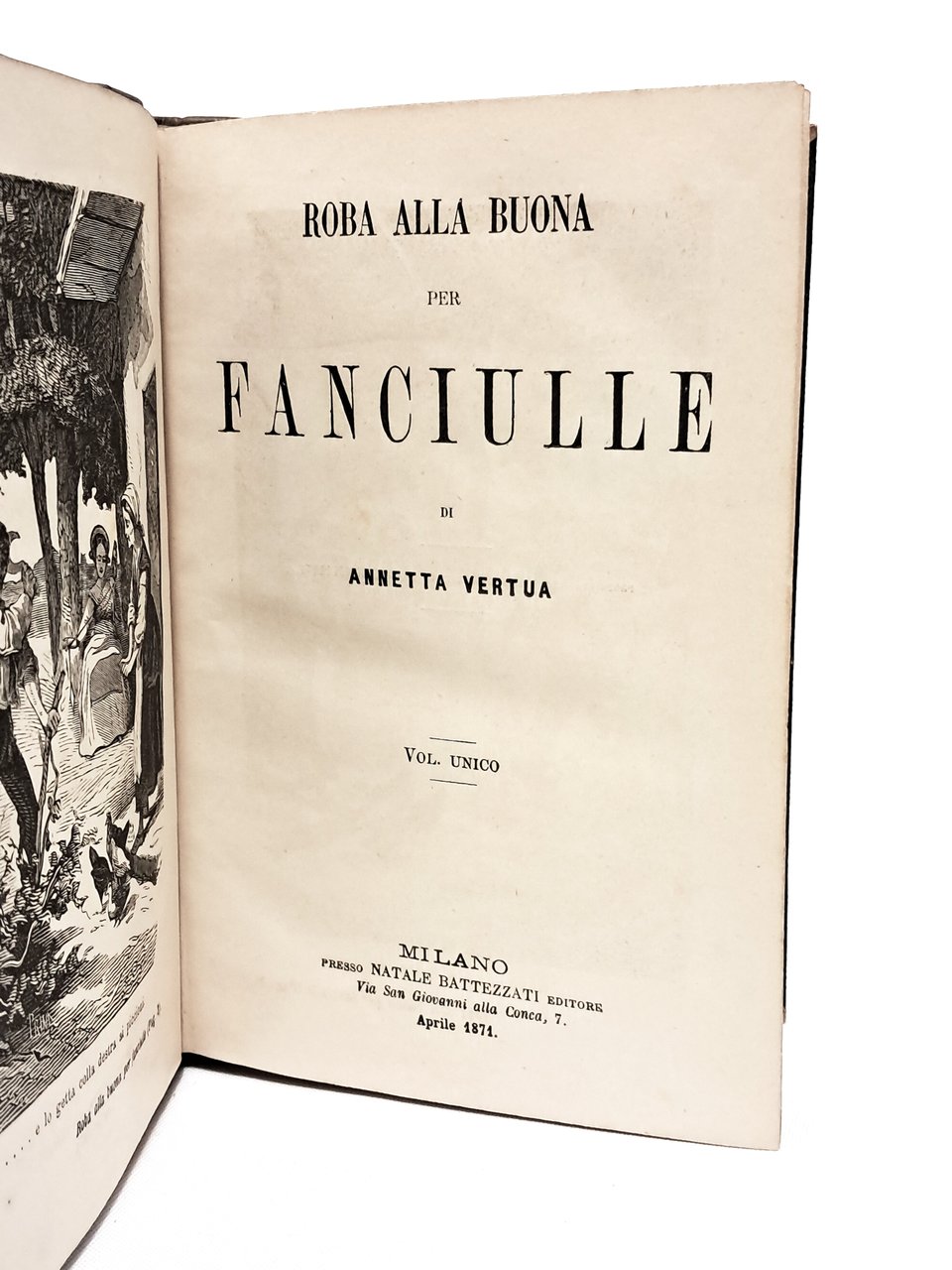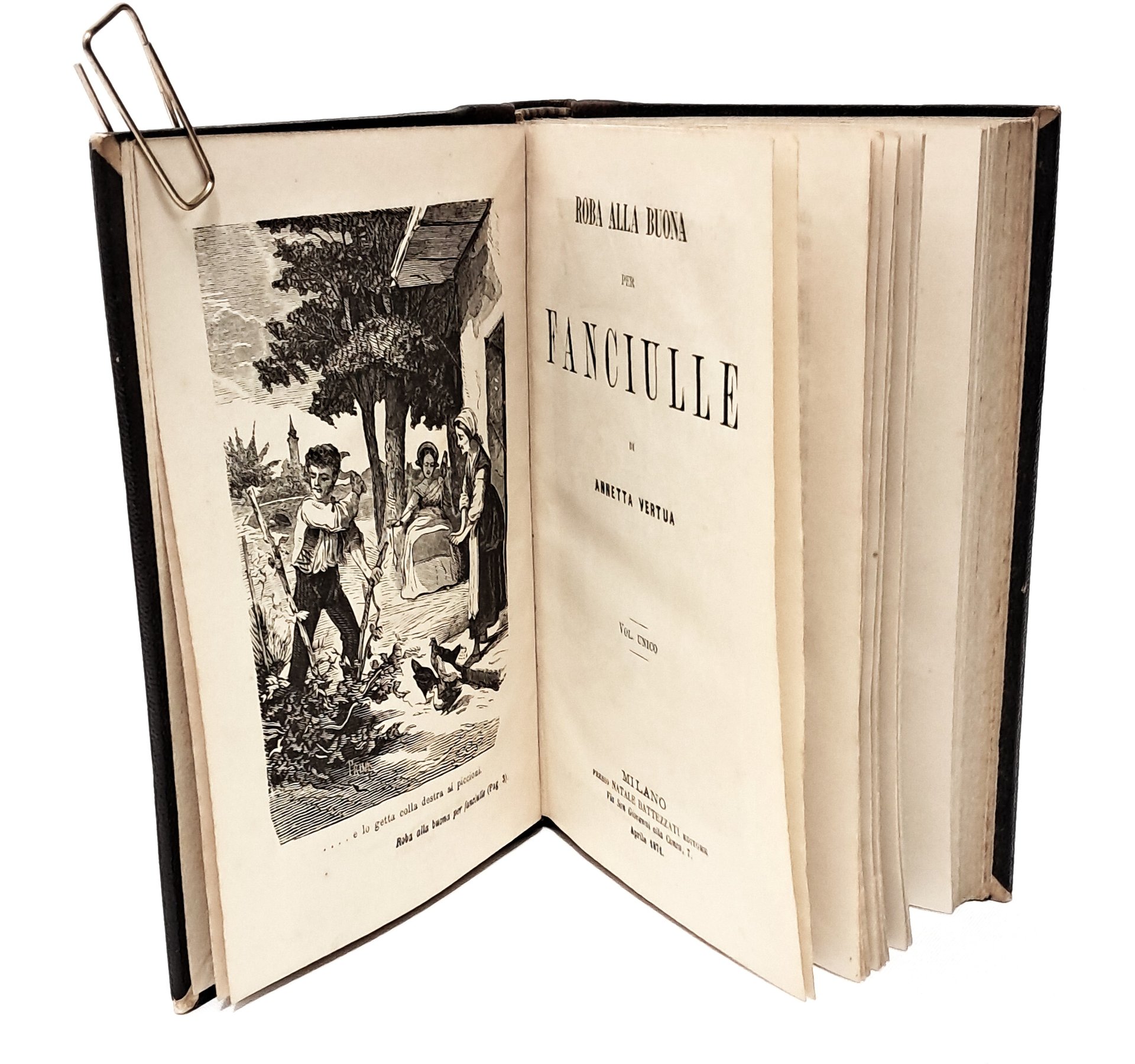 PRIME EDIZIONI di due opere rilegate in volume unico; Roba alla buona per fanciulle di Anna Vertua seguito da La Camicia conversazioni in famiglia sulle materie e le arti filerecce e tessili di Enrico Paglia Racconto per ragazze seguito da modelli di lettere, storielle e una commediola in due atti; corredato di belle incisioni fuori testo e nel testo. La camicia è un'opera "di agile divulgazione stesa in forma garbatamente narrativa - può dirsi che un libro di tal genere manca tuttavia all'Italia-". Fra gli argomenti toccati: Natura del filo Coltura del lino Lavoratura del lino Canape Altre piante tigliose Cotone Lana Bisso, amianto, vetro filato Macchien filatrici Tessitura comune Funi, reti, maglie Apparecchio e nomenclatura delle tele Coltura industriale del cotone, lino, canapa Industria manifatturiera di lino, canape, cotone Feltro e cappelli Setificio Tessitura meccanica Industria manifatturiera della lana e della seta Tessuti e chimica Cucitura a macchina Storia, igiene, resti e poesia della camicia. Corredato da 33 incisioni nel testo. Copertina cartonata. Pp. 206+VIII+180. Ottime condizioni.