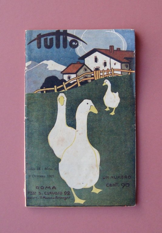 Periodico, Tutto" Settimanale Illustrato Anno III - N. 41 Roma, 9 Ottobre 1921 Stab.Tip. Tutto, Roma; cm. 22.5x14, pp. n.n., moltissime ill. fot.in b/n nel. t. e fuori. t., qualche pag. a colori, inserzioni pubblicitarie d'epoca in b/n in apertura di testo; brossura ed.ill. a colori . Numero completo. Condizioni di conservazione Esemplare in buone condizioni con tracce d'uso; dorso con strappetti e piccolissime mancanze alle cuffie; br. post. con piccole mancanze al margine inf., (vedi foto); br. ant con poche piccole macchiette e minuscole abrasioni ai margini; interni complessivamente buoni. "Gli Impianti idroelettrici e i servizi automobilistici in Abruzzo" 2 pagine di testo a firma Roberto Roberti + 2 foto Numero completo. OPEB.5348 blu "