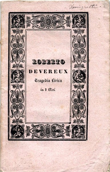 Libretto d’opera. Teatro Sociale di Mantova, Carnovale 1847. Macchia d’inchiostra al margine superiore della copertina posteriore. Annotazioni manoscritte coeve a p 5. Elenco dei personaggi completo dei nomi degli interpreti tra cui Teresa Tavola e Luigi Bernabei.