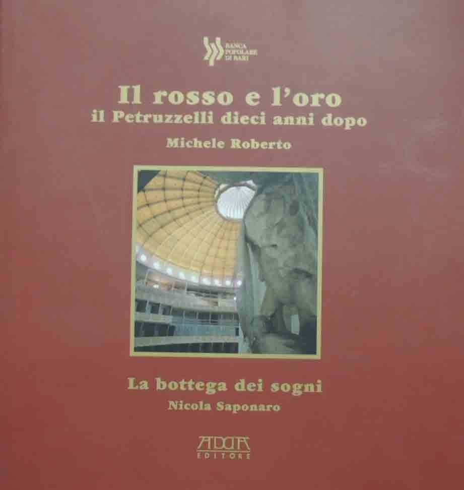 Il rosso e l’oro. Il Petruzzelli dieci anni dopo (1991-2001), foto di Michele Roberto, presentazione Marco Jacobini, introduzione Gian Marco Jacobitti, Lino Patruno, La notte dei fuochi, la sera delle trombe, foto Nicola Amato, Sergio Leonardi, La bottega dei sogni, commedia di Nicola Saponaro, Adda Editore, Bari 2002, pp. 167, in gran parte ill. col., cm 27, cart. ed. con titoli in oro al dorso e al piatto e sovraccoperta. In testa al frontespizio: Banca Popolare di Bari. Perfetto.
