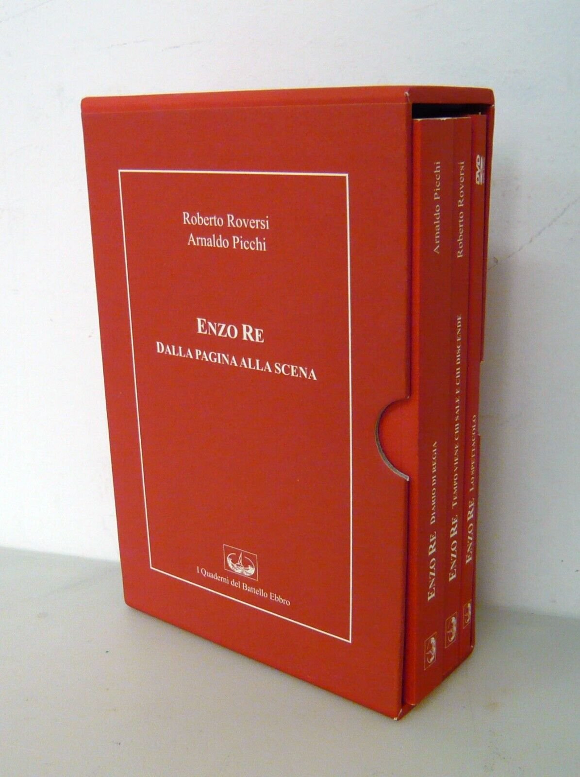 Roberto Roversi, Arnaldo Picchi,ENZO RE. DALLA PAGINA ALLA SCENA.2 VOLUMI + DVD.- Roberto Roversi ENZO RE.TEMPO VIENE CHI SALE E CHI DISCENDE, pp.219;- Arnaldo Picchi ENZO RE. DIARIO DI REGIA, pp.349- DVD Enzo Re. Rappresentazione del testo di R.Roversia Bologna, Piazza Santo Stefano, 23-26 giugno 1998,regia di Arnaldo Picchi, durata 125 minuti.I Quaderni del Battello Ebbro, Porretta Terme (BO) 2012,brossura, cm.15x22, custodia in cartoncino,peso: kg.1,2