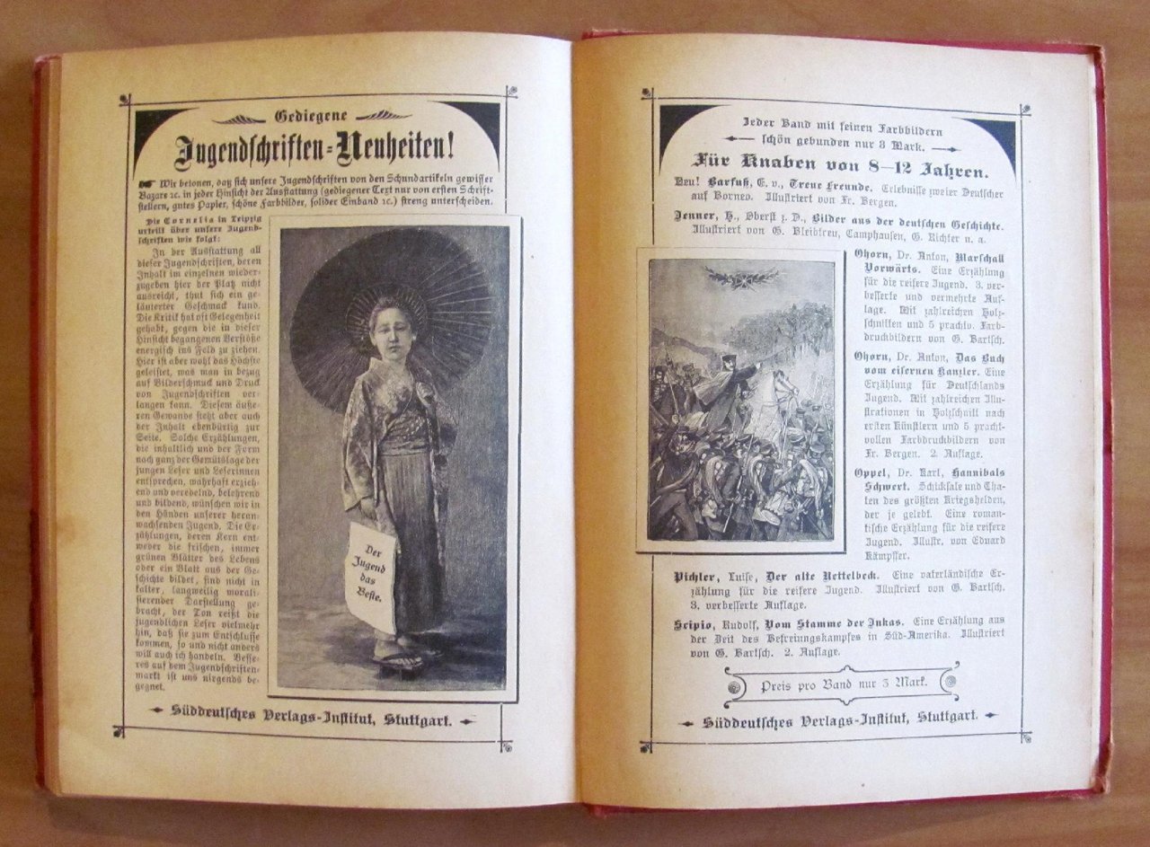 4 illustrazioni in b/n a piena pagina e 3 splendide tavole cromolitografiche f.t. di Max Flashar. Suddeutsches Verlags Institut - Stuttgart, s.d. ma 1899. Tela editoriale con titoli in oro al dorso e bella illustrazione a colori con titoli applicata al piatto. Lieve spellatura della carta alla cerniera anteriore. Firma di vecchia appartenenza datata 1899 in antiporta. 15,5x21,5; pp.169 + 5 pagine in fine di catalogo editoriale illustrato. Raro e in Buonissimo stato. , Molto buono (Very Good)