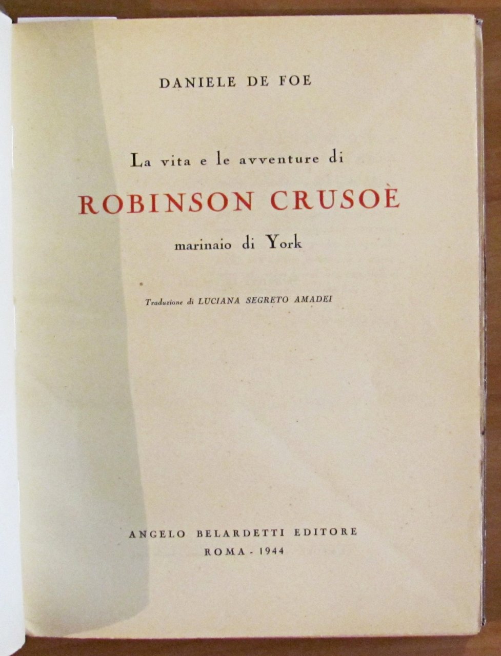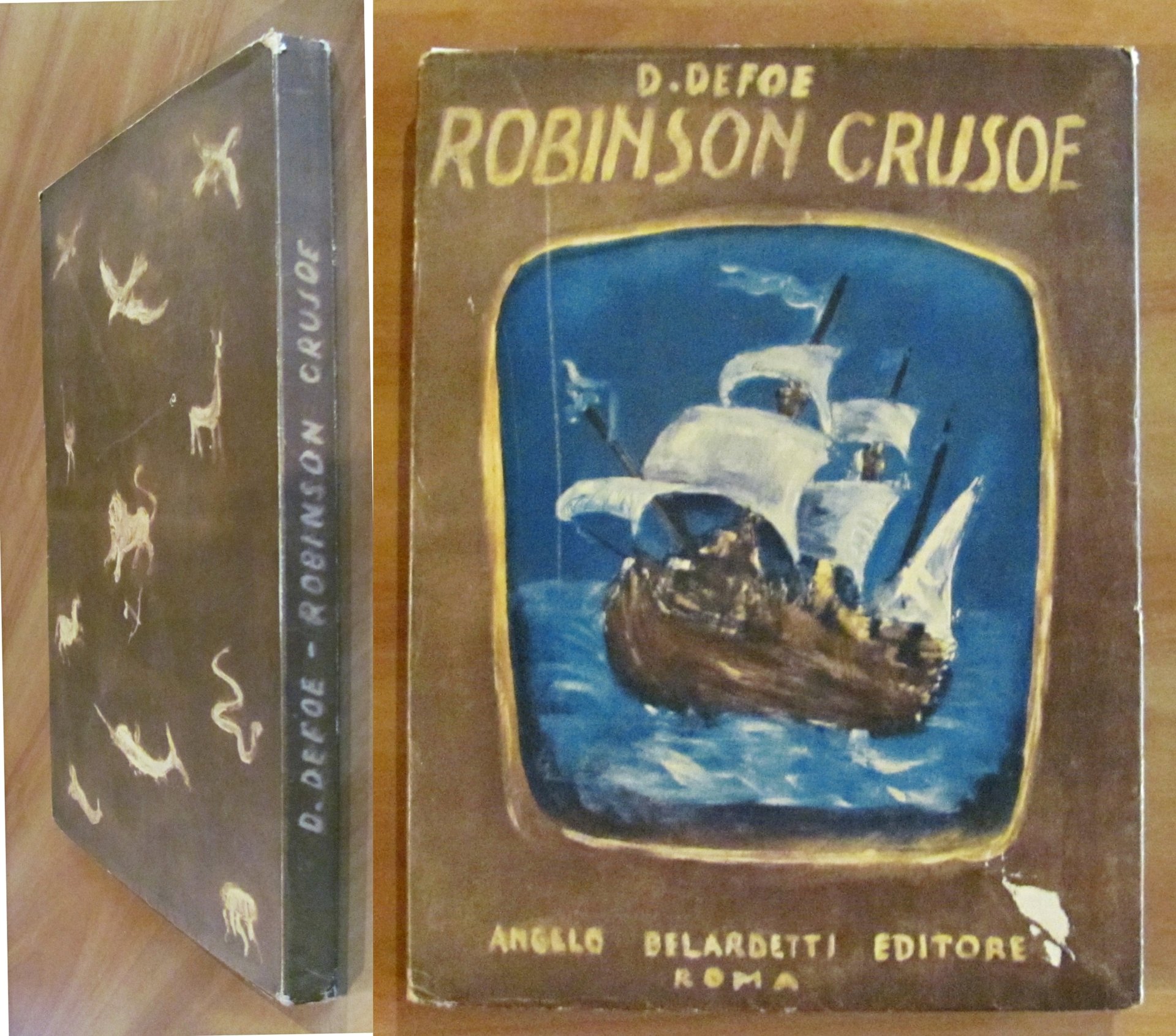 La vita e le avventure di Robinson Crusoè Marinaio di York. Tavole monocromatiche f.t. Editore Angelo Belardetti - Roma, 1944. Brossura editoriale con ali con piccolissima spellatura in basso al piatto. 22x29; pp.177. Buonissimo stato. , Molto buono (Very Good)