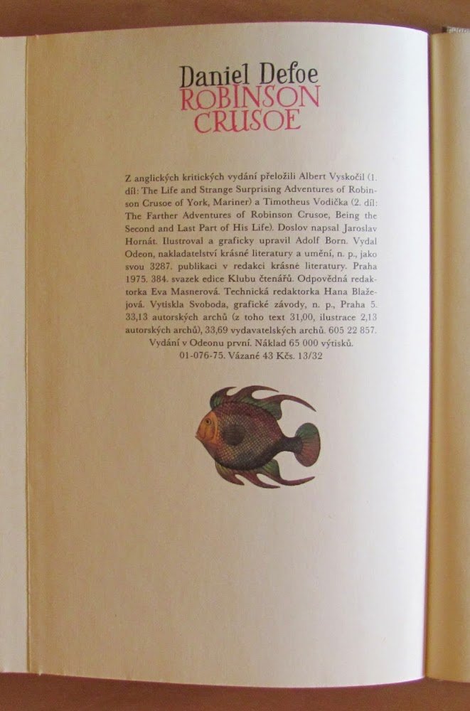 Parte I: Marinaio di York; Parte II: Seconda e ultima parte della sua vita. 12 belle tavole a colori f.t. di Adolf Born. Editore Odeon - Cecoslovacchia, 1975. Tela editoriale con titoli al dorso e sovraccoperta originale illustrata. Piccole imperfezioni e mancanze alle cuffie del dorso della sola sovraccoperta. Peraltro Come Nuovo. 17x24,5; pp.508. Raro e in Ottimo stato. , Molto buono (Very Good)