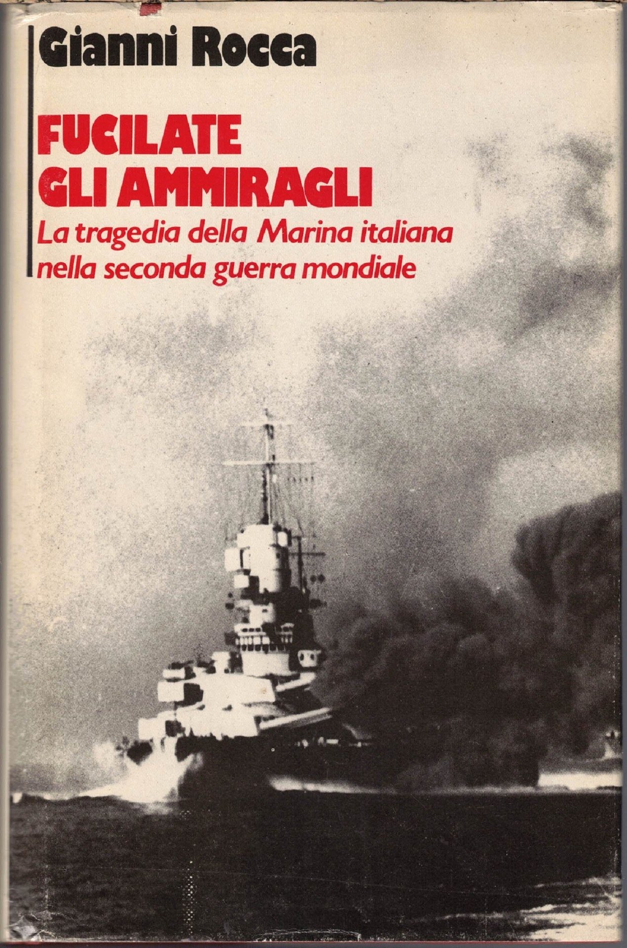 Gianni Rocca, Fucilate gli ammiragli. La tragedia della Marina italiana nella seconda guerra mondiale, CDE spa, Milano 1987, pp. 323, 8 c. di tavv. f.t. ill. b.n., cm 22, cart. ed. con titoli e fregi in oro al dorso, fregi a impressione al piatto e sovraccoperta. Edizione CDE spa su licenza della Arnoldo Mondadori Editore S.p.A. Leggere tracce d’uso alla sovraccoperta, minime fioriture al taglio superiore, lieve brunitura della carta, per il resto esemplare ben conservato.