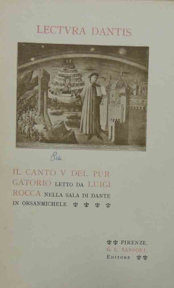 Il Canto V del Purgatorio letto da Luigi Rocca nella Sala di Dante in Orsanmichele, G. C. Sansoni Editore, Firenze 1925, pp. 46, ill. b.n., cm 24, br. ed. Collana Lectura Dantis. Testo della lettura effettuata nella Sala di Dante in Orsanmichele il 28 febbraio 1901. Leggere tracce d’uso alla brossura, con una piccola annotazione a biro alla prima di copertina e minimi strappetti al dorso, lieve ingiallitura della carta, qualche fioritura, sporadiche sottolineature a pastello, ma nel complesso esemplare in buono stato di conservazione.