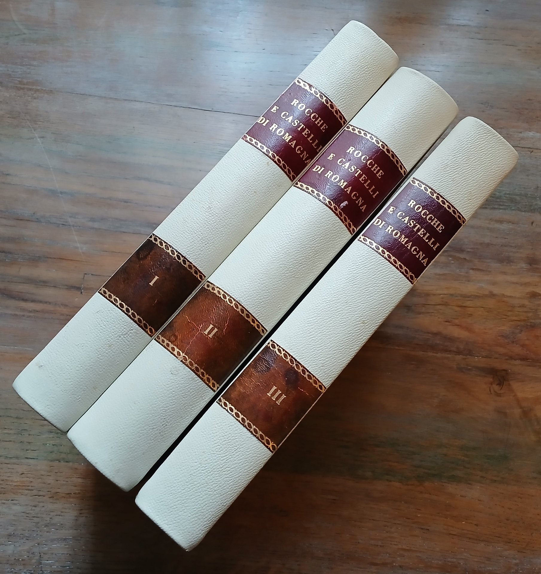 (Romagna; Fortificazioni; Architettura militare; Fortezze e torri romagnole) Tre volumi in 4°, legature in mezza pelle avorio, ai dorsi doppio tassello in pelle ocra con titoli e numerazione impressi in oro. Volume 1 : Imola, Faenza e il Ravennate, 1970, pp. 404 con 510 ill. in bianco e nero e 2 a colori nel testo, una pianta ripiegata. Volume 2 : Cesena e il Forlivese, 1971, pp. 468 con 559 ill. in bianco e nero e 2 a colori nel testo, una pianta ripiegata. Volume 3 : Rimini e il Montefeltro romagnolo, 1972, pp 440 con oltre 500 ill. anche a colori nel testo ed una pianta ripiegata. Presentazione di Pietro Gazzola. Lavoro redazionale e campagna fotografica a cura di Gianfranco Fontana. Contributi di Domenico Berardi, Antonio Cassi Ramelli, Ferruccio Montevecchi, Gaetano Ravaldini, Franco Schettini, Marina Foschi, Sergio Venturi, Gianfranco Fontana, Pier Giorgio Pasini. Collana "Storia, costumi e tradizioni". Prima edizione. Ottimo stato di conservazione.