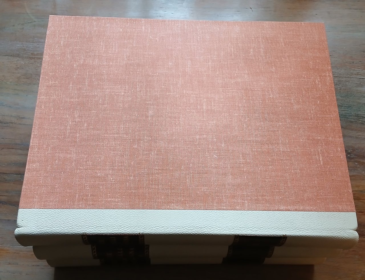 - legature in mezza pelle avorio, ai dorsi doppio tassello in pelle ocra con titoli e numerazione impressi in oro.