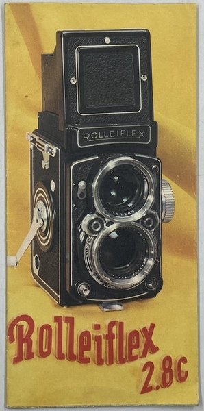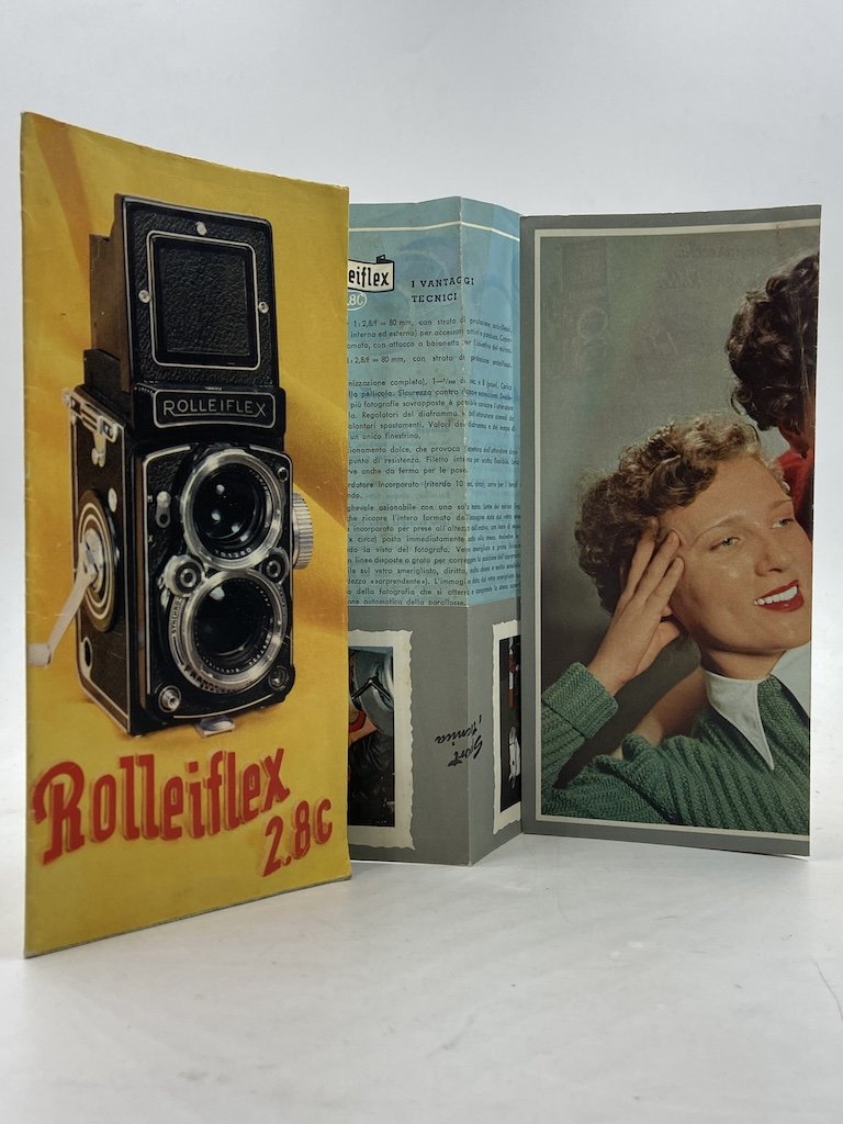 Pieghevole pubblicitario a colori, misura pienamente dispiegato cm 56x28 ed ripiegato in 6 pagine cm9.5x28 e altrettante mezze pagine cm9.5x8 per ciascuna faccia, a colori il recto, in bicromia il verso. In italiano, reclamizza la Rolleiflex 2.8c, introdotta nel 1952.