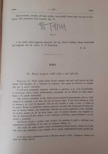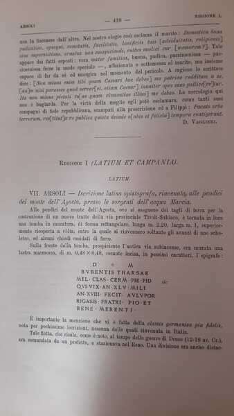 In 4? (cm 30), Brossura moderna in carta Varese, pagg.17 Stralcio di pagg. 17 ( pagg. 409-426) con 1 ill. b.n. n.t., ben conservato contenente notizie relative a: Roma ("Nuove scoperte nella citt? e nel suburbio"); Arsoli ("Iscrizione latina opistografica, rinvenuta alle pendici del monte dell'Agosta, presso le sorgenti dell'acqua Marcia"); Boscoreale ("Avanzi di una villa romana in piazza mercato"); Pompei ("Relazione degli scavi fatti nel mese di ottobre 1898"); Casale ("Iscrizioni sepolcrali latine riconosciute dell'abitato"); Scanno ("Antichit? varie rimesse a luce nel tenimento del Comune"); Castel di Sangro ("Antichit? romane scoperte in contrada La Civita ed a Fontemaiuro"). L'articolo su Roma firmato da Dante Vaglieri (Trieste, 1865?Ostia antica, 1913); quello su Arsoli da L. Borsari, quello su Boscoreale e Pompei da Antonio Sogliano (Napoli 1854-1942), quello su Casale dell'aquilano Niccol? Persichetti, quello Scanno e Castel di Sangro da Antonio De Nino (Pratola Peligna 1833 - Sulmona, 1907).