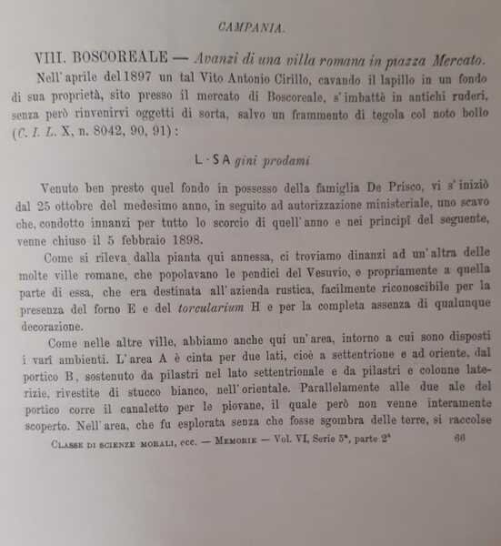Roma - Arsoli - Boscoreale - Pompei - Casale - Scanno - Castel di Sangro - Terranova fausania. Tratto da "Notizie degli Scavi di Antichit? comunicate alla R. Accademia dei Lincei. Ottobre 1898".