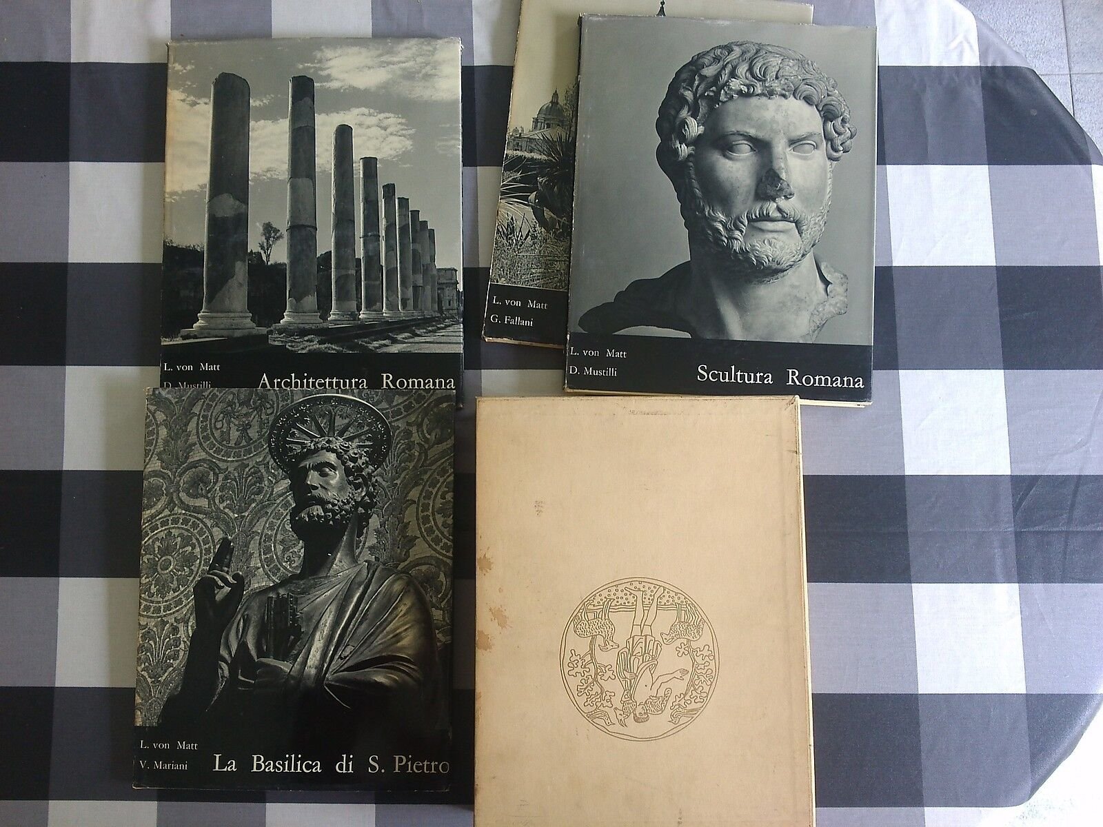 Von Matt - ROMA cofanetto 4 volumi La Basilica San Pietro, Scultura romana, Vaticano Artistico, Architettura romana Stringa Editore Prima edizione 1958 Libri in ottime condizioni, minimi segni del tempo. Tutti i volumi hanno sovraccoperta integra ma leggermente usurata. Il cofanetto presenta vari segni, leggere abrasioni e delle macchie visibili in foto. Non esitate a contattarci per altre foto o richieste.