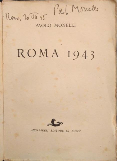 Migliaresi Editore in Roma, Febbraio, 1945. In 8vo, pp. 442 (con Indice), bross. edit. in carta. Conservata in fondo al volume fascetta di Errata Corrige. Dedica alla prima bianca e firmato “Roma, 20 VII 45 Paolo Monelli”. Esemplare con i piatti staccati, ingillimento e fioriture del tempo ma comunque completo e fruibile.