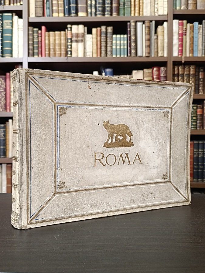 Album in-8° (cm. 24x32), solida e suggestiva legatura del tardo XIX secolo realizzata da Enrico Andersen (Roma) in piena pergamena rigida, dorso liscio con filetti ed eleganti fregi in oro, piatti inquadrati da ampie cornici con doppia bordura in oro e blu, titolo e lupa capitolina in oro al centro di quello anteriore (tracce d'usura), tagli bordeaux. Raccolta di 40 suggestive fotografie in nero di cm. 20x26 applicate su cartoncino (fioriture sparse, gora all'ultimo che non tocca l'immagine). I<span style="font-size: 13.333333px;">llustrano </span>monumenti, piazze e luoghi storici della città di Roma, alcune con passanti, pescatori, carrettieri, guardie. Buon esemplare. (NX)
