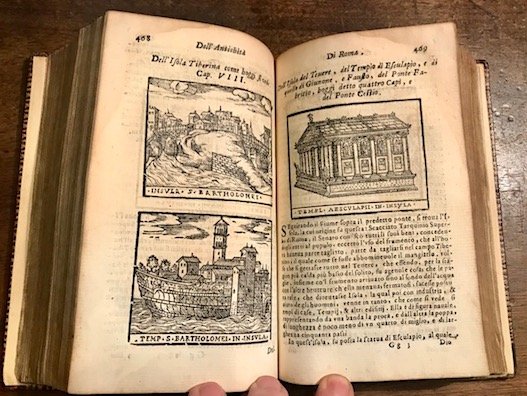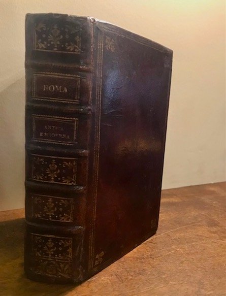 8vo (cm. 17), 16 cc.nn. (compresa antiporta allegorica), 896 (i.e. 806) pp. Con 332 illustrazioni xilografiche n.t. (di cui una a piena pagina). Frontespizio in rosso e nero. Da p. 449 con proprio frontespizio ma paginazione continua ‘Roma antica figurata’. Affascinante legatura coeva in marocchino rosso con nervi, fregi e titoli oro su doppio tassello al ds. Cornici ai piatti con fleurons angolari. Tagli dorati. Nota di appartenenza ottocentesca ms. al frontespizio. Alcuni lievi aloni, un po’ più accentuati sulle prime ed ultime carte, ma nel complesso esemplare in ottimo stato di conservazione. Raro. Rossetti, G-778.
