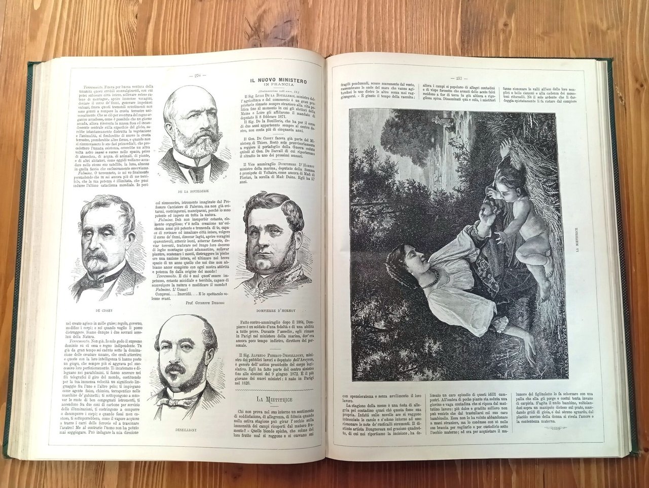 Raccolta delle prime due annate del periodico "Roma. Antologia illustrata - Cronaca artistica scientifica letteraria e industriale" - Due volumi rilegati in coeva mezza pelle con titolo in oro al dorso, pp. VI, (4), 408, (2), VIII, 408 - ovvero dal n. 1 del novembre 1872 al n. 51 dell'ottobre 1874. Frontespizio generale delle annate con allegoria di "Roma" in forma muliebre sullo sfondo di San Pietro; numerosissime illustrazioni xilografiche, nel testo, a piena o doppia pagina, molte delle quali dedicate ad architetture, monumenti e vedute di città e temi biblici (da Doré). Argomenti di: letteratura, belle arti, archeologia, geografia, fisica, meteorologia, igiene, botanica, industrie, meccanica, musica, storia, ecc. Occasionali fioriture o gore alle carte; ancor più rare le lacune mendate; nel complesso opera integra e ben conservata, fruibile in ogni sua parte; pubblicazione non comune.