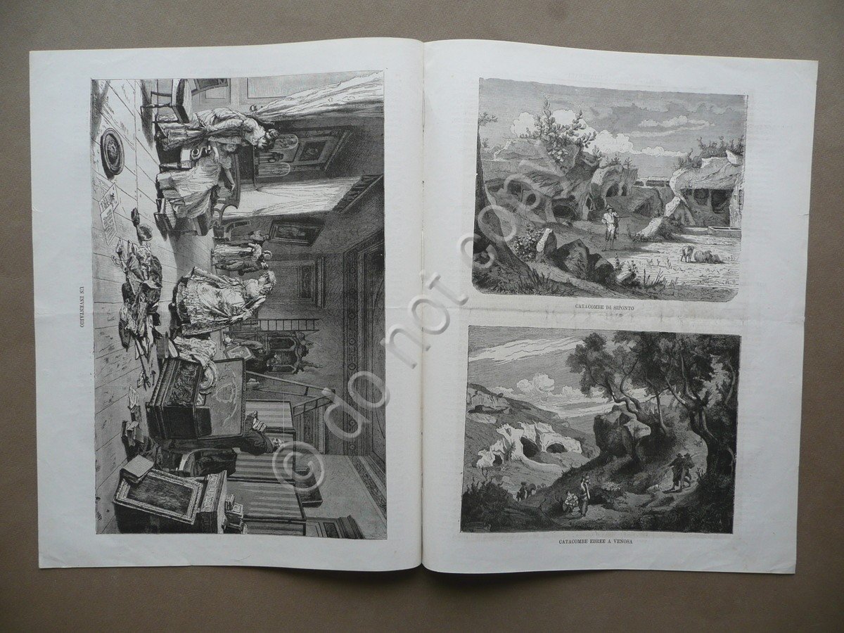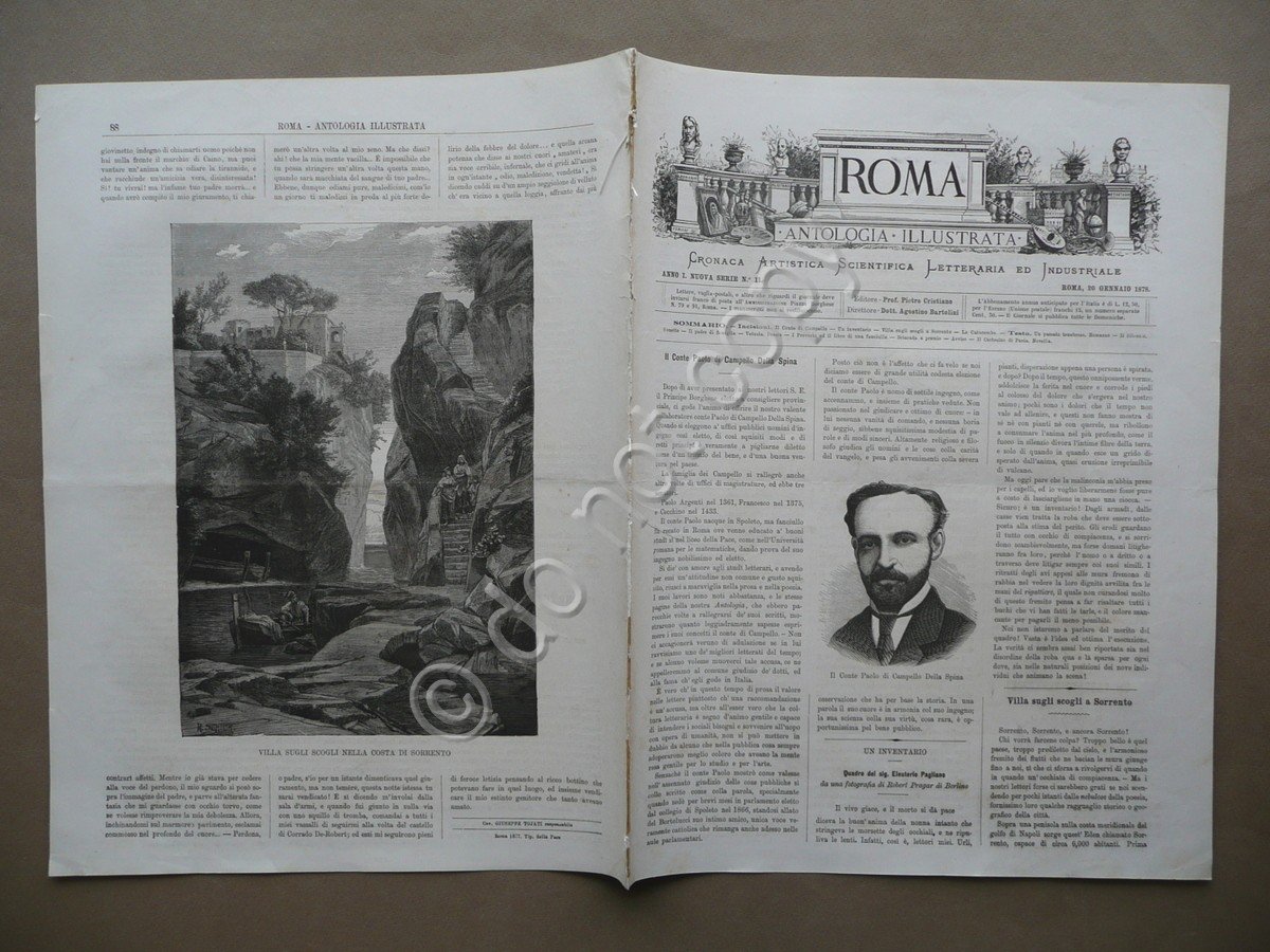 Settimanale, Roma Antologia Illustrata Cronaca Artistica Scientifica Letteraria ed Industriale Anno I, nuova serie N.11 Roma, 20 Gennaio 1878 Tip. della Pace, Roma 1878, cm 35x27, da pagina 81 a pagina 88 (esemplare autonomo) con cinque belle incisioni di cui tre fuori testo, due bifoli legati con cordella. Numero completo. Condizioni di conservazione Esemplare in buone condizioni con tracce d'uso, lieve piega centrale di conservazione, minime trascurabili bruniture, un margine con due piccoli strappetti che interessano tutte le pagine, alcuni dei quali restaurati con l'applicazione di una piccola striscia in cartoncino, dorso con braghetta di rinforzo alla metà inf. e alla cuffia sup., e con leggere tracce di precedente inserimento entro raccolta. Cinque belle incisioni in bianco e nero di cui tre fuori testo, due relative alle catacombe di Siponto e a quelle Ebree a Venosa, e una intitolata Villa sugli scogli nella costa di Sorrento". "
