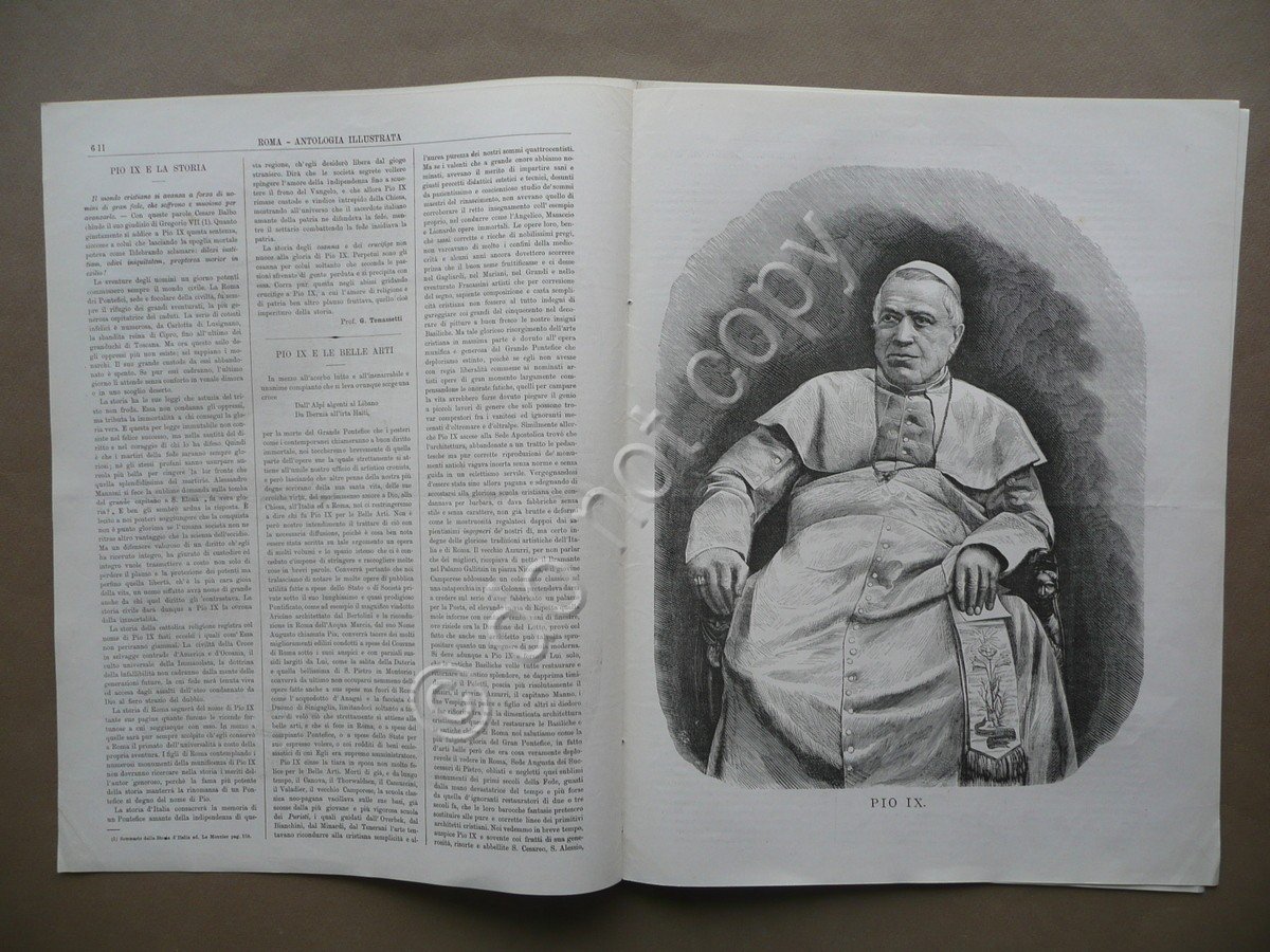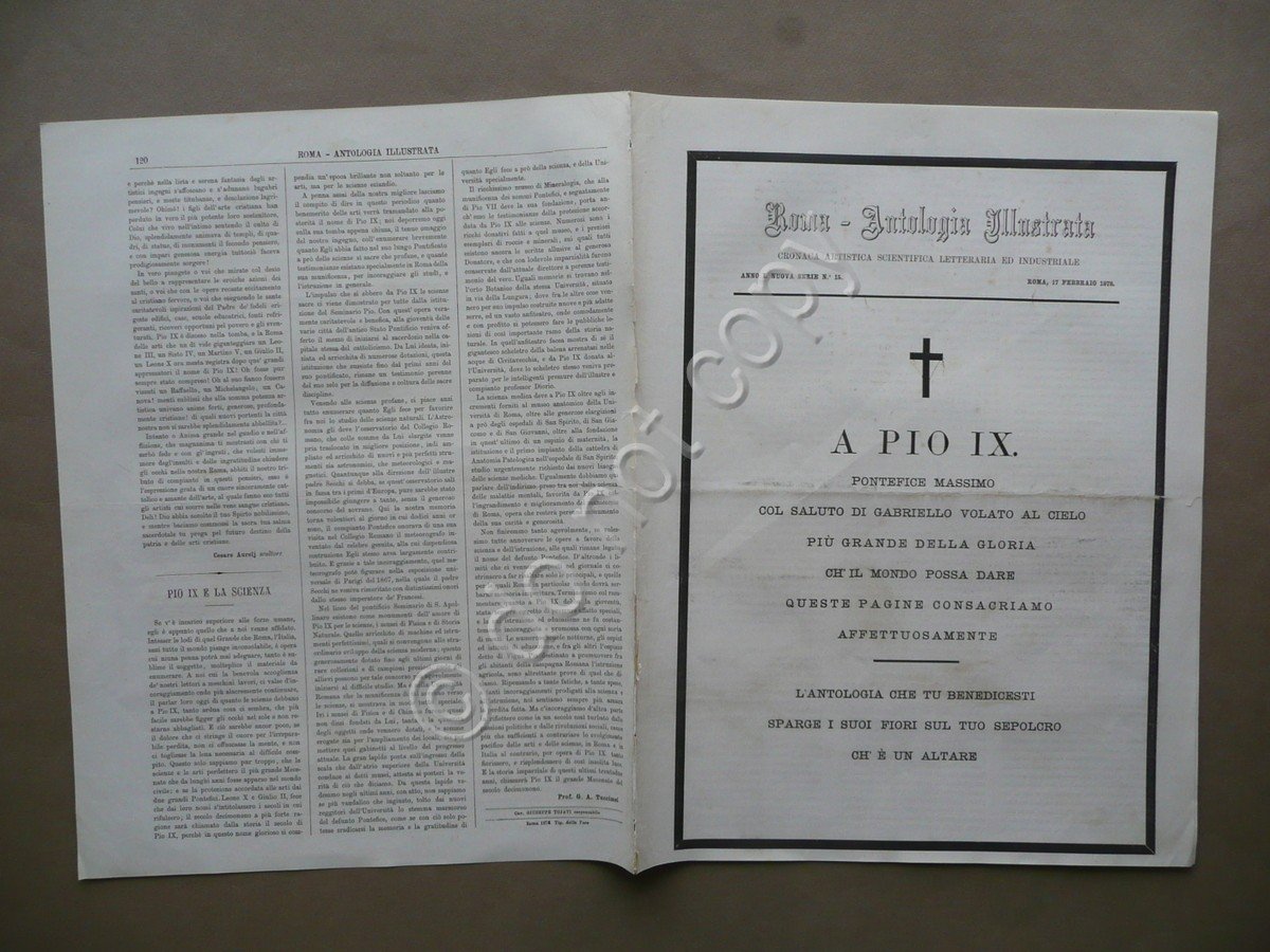 Settimanale, Roma Antologia Illustrata Cronaca Artistica Scientifica Letteraria ed Industriale Anno I, nuova serie N.15 Roma, 17 Febbraio 1878 Tip. della Pace, Roma 1878, cm 35x27, da pagina 113 a pagina 120 (esemplare autonomo) con un grande ritratto di Papa Pio IX inciso a piena pagina, due bifoli sciolti. Numero completo. Condizioni di conservazione Esemplare in buone condizioni con tracce d'uso, lieve piega centrale di conservazione, prima e ultima pagina con poche minime bruniture e qualche lievissimo alone, dorsi con minimi forellini per precedente legatura con cordella, dorso di un bifolio con due strappi di alcuni cm, uno dei quali restaurato tramite l'applicazione di una braghetta, e leggere tracce di precedente inserimento entro raccolta. Numero dedicato alla scomparsa di Papa Pio IX, con grande ritratto del Pontefice inciso a piena pagina (vedi foto).