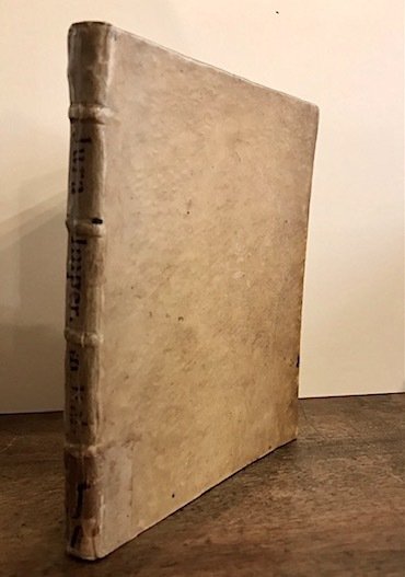 4to (cm. 19,8), 38 pp, 1 c.nn. bianca (segue) Idem, Continuatio jurium majestatis Caesareae in Italiam., Ibidem, apud Joh. Georg Cottam 1718, 20 pp. (segue) Idem, Continuata Disquisitio in jura majestatis Caesareae in Italiam competentia., Ibidem, apud Joh. Georg Cottam 1718, 16 pp. Legatura coeva in pergamena rigida con nervi e titolo ms. al ds. Breve annotazione di antica mano sulla carta di guardia libera anteriore (’Prohibitus Decreto 21 Januarii 1721’). Bruniture sparse ed un percorso di tarlo al margine bianco esterno di quasi tutto il volume. Buon esemplare nel complesso. Raro.