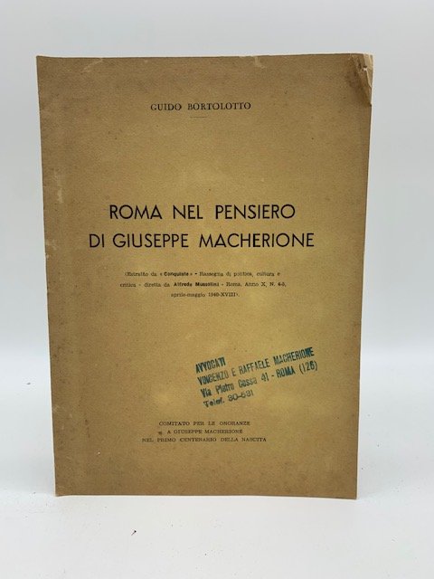 In 8, cm. 17 x 24, pp. 8 non numerate. Brossura in cartoncino morbido, timbro di possesso al piatto anteriore. In condizioni molto buone. Estratto da "Conquiste" rassegna di politica, cultura e critica diretta da Alfredo Mussolini - Roma Anno X, n. 46, aprile-maggio 1940. Opuscolo realizzato dal Comitato per le onoranze a Giuseppe Macherione in occasione del primo centenario della nascita. Lo scritto e' stato radiotrasmsso dall'E.I.A.R. il 15 aprile 1940.