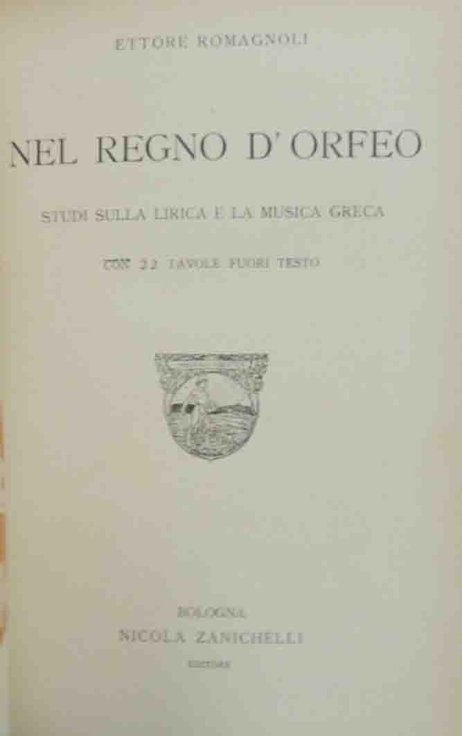 Ettore Romagnoli, Nel regno d’Orfeo. Studi sulla lirica e la musica greca, con 22 tavole fuori testo, Nicola Zanichelli Editore, Bologna 1921, pp. 291, 22 c. di tavv. f.t. ill. b. n., cm 21, legatura in tela con titoli in oro al dorso. Firma d’appartenenza, luogo e data alla prima pagina, e al retro del frontespizio. Minima abrasione alla cuffia superiore, qualche fioritura, carta lievemente brunita, sporadiche sottolineature a pastello su qualche pagina, per il resto ben conservato.