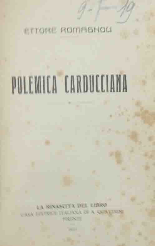 Ettore Romagnoli, Polemica carducciana, La Rinascita del libro – Casa editrice italiana di A. Quattrini, Firenze 1911, pp. 275, cm 19, legatura in similpelle verde muta. Indice: E. Romagnoli, I Greci e il verso libero – Id., Per Giosuè Carducci – E. Romagnoli e G. Prezzolini, La filosofia e la critica letteraria – E. Romagnoli, Per finire – M. Bontempelli, Il Carducci critico – Id., Nel Seicento – E. Romagnoli, I preparatori dell’humus – B. Croce, Postilla – V. Morello, Un equivoco – E. Romagnoli, Il pensatoio – M. Bontempelli, Violazione di segreto epistolare – E. Bodrero, Per una postilla – V. Morello, Per la critica letteraria e per gli scrittori delle Cronache – G. Bellonci, Una grande polemica – M. Bontempelli, La guerra d’Alba – G. Bellonci, La libertà della critica e la dogmatica positiva – V. Morello, Anche un po’ di Balzac – E. Romagnoli, Gli eroi – M. B., B. Croce, Schermaglie – Le cronache letterarie, Le roi des Camelots – La Rassegna contemporanea, Un poco di luce intorno a una polemica – E. Romagnoli, Carducci e i nuovi sofisti – Id., Il divorzio. Firma d’appartenenza, luogo e data all’occhiello. Segnatura di collocazione al frontespizio e alla prima pagina di testo. Minima abrasione al piatto posteriore, una piccola mancanza all’occhiello, fioriture, carta lievemente brunita, per il resto ben conservato.