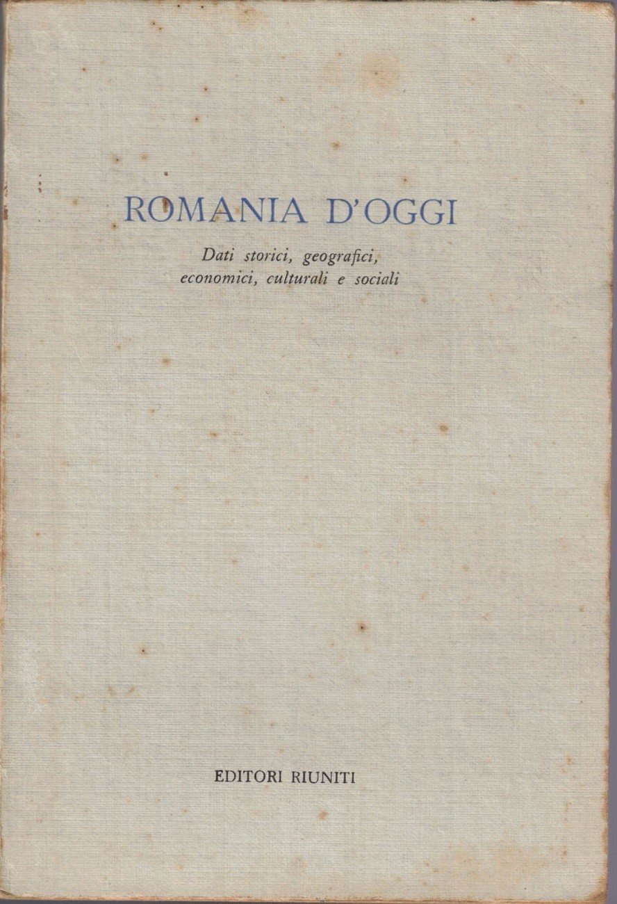 Romania d’oggi. Dati storici, geografici, economici, culturali e sociali, Editori Riuniti, s.l. (ma stampato a Roma, presso la Tipografia La Stampa Moderna) 1957, pp. 169, cm 17, br. ed. Collana Problemi del giorno. Serie Documenti. Indice: Origine e formazione dello Stato romeno – Geografia fisica, economica e umana – La repubblica popolare – Sviluppo della economia – Osservazioni particolari sull’industria – Trasformazioni e sviluppo dell’insegnamento. Leggere tracce d’uso, piccolissime abrasioni alla brossura, minime fioriture a brossura e tagli, tenue brunitura della carta, per il resto esemplare ben conservato, con brossura solida e interno pulito e ben tenuto.