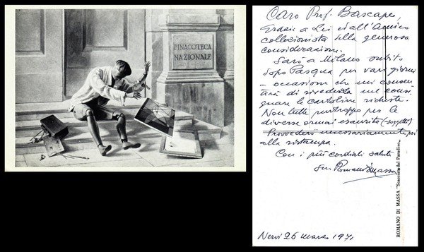cartolina manoscritta e firmata di Romano di Massa datata Nervi, 26 Marzo 1971 riproducente al verso una sua opera; buon es.