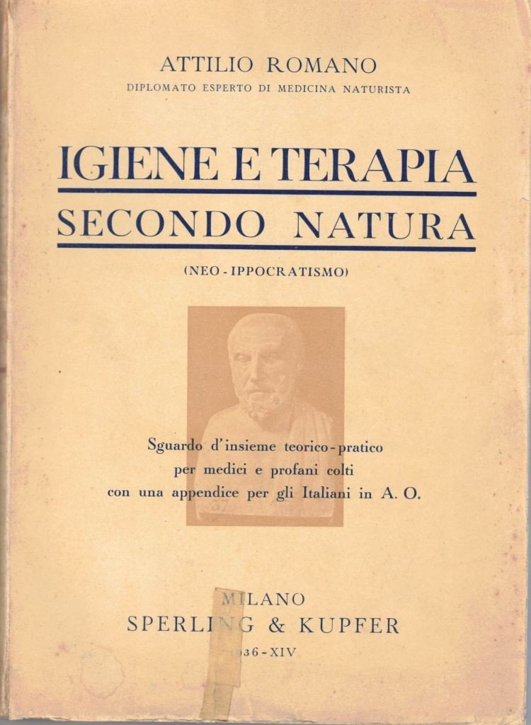 Attilio Romano, Igiene e terapia secondo natura. (Neo-ippocratismo). Sguardo d’insieme teorico-pratico per medici e profani colti con una appendice per gli Italiani in A. O., Soc. A. Italiana Sperling e Krupfer Editori e Librai, Milano 1936 XIV, pp. XV, 166, cm 24, br. ed. con alette. Sigla di appartenenza alla prima carta bianca. Uno strappetto restaurato a margine della prima di copertina, un segnetto di biro ad una carta, per il resto minime fioriture, lieve brunitura della carta, ma nel complesso ben conservato.