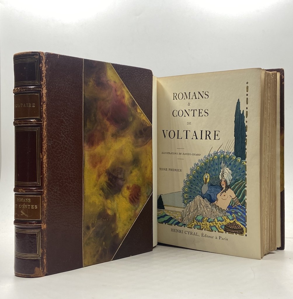 Due volumi in legatura coeva in mezza pelle con angoli, titoli dorati su tasselli, fregi dorati e falsi nervi, cm15x20, pp (6) 376 (4), (6) 339 (7), illustrazioni a colori di Daniel Girard (Paris 1890-1970). Raffinata edizione illustrata dei romanzi e racconti di Voltaire, tirata in 850 esemplari (questo uno degli 800 su Vélin de Rives) da Henry Cyral. Conservate, nella legatura, le brossure illustrate di entrambi i volumi.