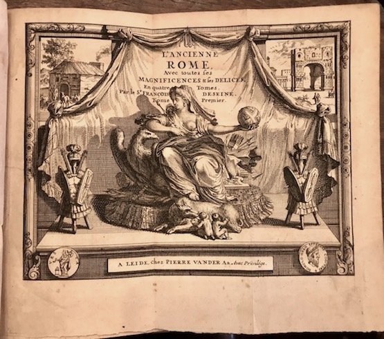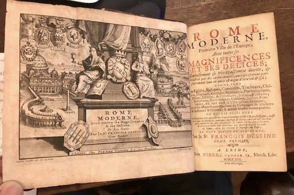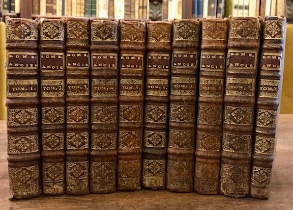 12mo (cm. 16), 10 Voll.; 14 cc.nn., 1738 pp., 10 cc.nn.; 14 cc.nn., 1148 pp. Opera completa. Il ricchissimo apparato iconografico, tutto composto da incisioni calcografiche, è formato da 5 frontespizi allegorici o architettonici ripiegati, 40 tavole f.t. ripiegate (carte geografiche, vedute e piante della città di Roma, tra cui la grande pianta di G.B. Falda di cm. 57x49 ca.), 194 illustrazioni a piena pagina n.t. I frontespizi tipografici presenti nel primo vol. de ‘L’Ancienne Rome’ e in tutti e sei i volumi de ‘Rome Moderne’ sono stampati in rosso e nero. Legature coeve in piena pelle con nervi, ricchi fregi e titoli oro impressi al ds. (tracce d’usura, lievi abrasioni e qualche mancanza soprattutto alle cuffie). La numerazione dei volumi va da 1 a 10 in numeri romani e sul tassello il titolo indicato per tutti e dieci i volumi è ‘Rome ancie’. Tagli rossi. Due ex libris di collezioni private ai contropiatti anteriori. Alcune carte e tavole leggermente brunite e sporadiche arrossature. Nel complesso esemplare in più che buono stato di conservazione. Opera assai rara a trovarsi completa delle due Parti ed in legatura uniforme. I primi sei volumi contengono ‘Rome Moderne’, gli altri sei ‘L’Ancienne Rome’. Cfr. Rossetti 2266 e 2267; Schudt, 556 e 557; Olschki (n. 16815): ‘C’est la guide de Rome le plus etendu en langue française. La premiere edition plus mince et tres incorrecte avait paru a Lyon en 1690. Dans les prefaces l’auteur cite ses sourses; dans la Rome moderne c’est a Titi qu’il a les plus abbondamment puisé. Les figures sont tirées de celles de Lauro, Filippo Rozzi, Falda et autres graveurs’.