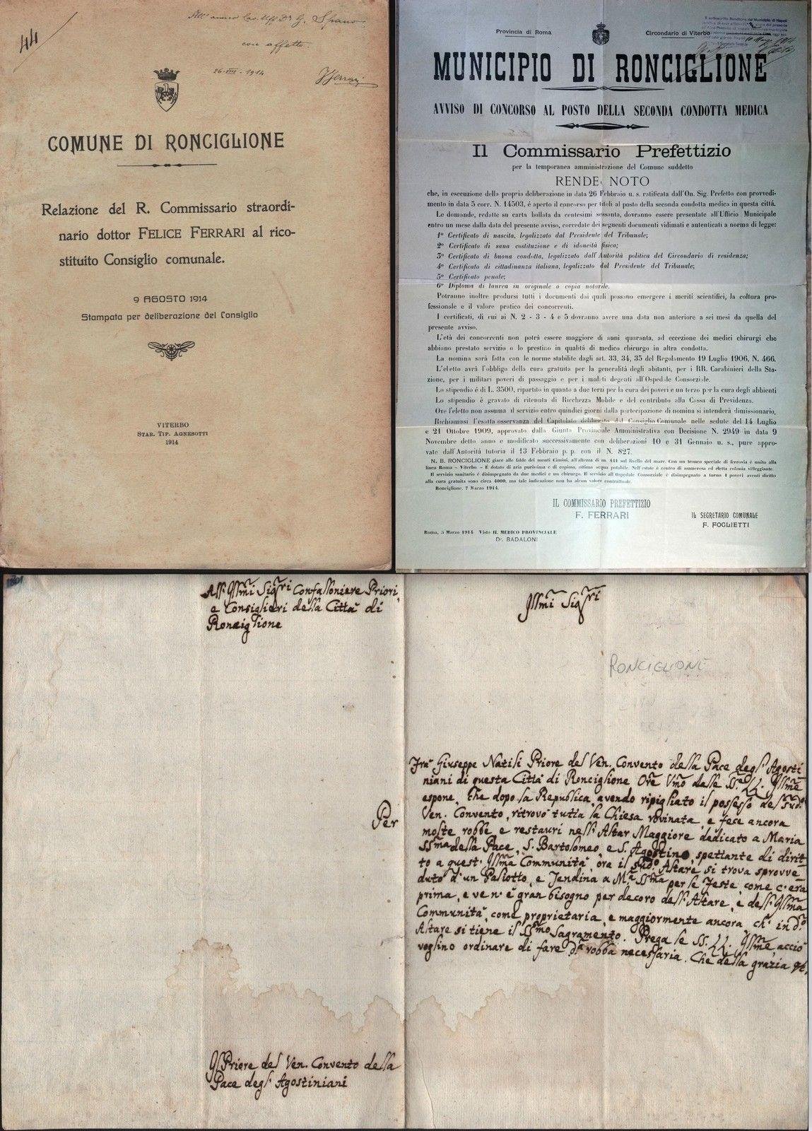 COMUNE DI RONCIGLIONE RELAZIONE DEL R. COMMISSARIO STRAORDINARIO FELICE FERRARI AL RICOSTITUITO CONSIGLIO COMUNALE. AGOSTO 1914. VITERBO STABILIMENTO AGNESOTTI 1914. PP. 87 CM. 31 X 22. UNITO BANDO PER CONCORSO MEDICO CONDOTTO DATATO 10 MARZO 1914 CM. 69,5 X 50 UNITO. LETTERA MANOSCRITTA SU CARTA VERGATA, (FILIGRANA ANCORA) DEL PRIORE DEL CONVENTO DEGLI AGOSTINIANI DI RONCIGLIONE IN CUI DICHIARA DI AVER PRESO POSSESSO DEL CONVENTO, DI AVERLO TROVATO ROVINATO E DI NON TROVARE PIU' IL PALIOTTO DEDICATO A 0 MARIA SANTISSIMA. LA LETTERA E' MOLTO PIU' ANTICA DEGLI ALTRI DOCUMENTI. CM. 25 X 18,5 IL FOGLIO.INTERESSANTE RESOCONTO DEL NUOVO INSEDIAMENTO DEL CONSIGLIO COMUNALE DEL COMUNE DI RONCIGLIONE, CON ELEZIONE DEL NUOVO 0 SINDACO DOMENICO TEDESCHI, BELLISSIMA DEDICA ALLA PRIMA DI COPERTINA DEL COMMISSARIO STRAORDINARIO FELICE FERRARI L 4031 FIRMA AUTOGRAFA DEL PREFETTO FERRARI, UNITO BANDO PER MEDICO CONDOTTO E LETTERA MANOSCRITTA PRIORE DEL CONVENTO DEGLI AGOSTINIANI. INTERESSANTE RESOCONTO DELL'INSEDIAMENTO DEL NUOVO SINDACO. LEGATURA EDITORIALE MORBIDA CON ALCUNE MANCANZE E MACCHIE, FIRMA AUTOGRAFA DEL PREFETTO FELICE FERRARI IN COPERTINA, DORSO CON STRAPPI E MANCANZE, PAGINE INTERNE IN BUONE CONDIZIONI, QUALCHE RARA FIORITURA. IL MANIFESTO » RIPIEGATO, TIMBRO E FIRMA AUTOGRAFA IN ALTO A DESTRA, LA LETTERA » SU DUE PAGINE, QUATTRO FACCIATE, ALONE DI UMIDITA' IN BASSO VISIBILE NELL'IMMAGINE