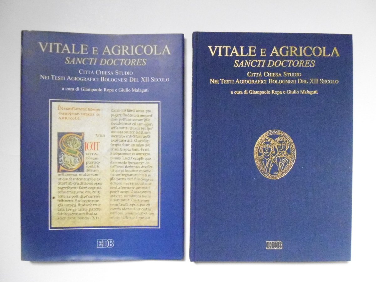 G. Ropa, G. Malaguti (a cura di), Vitale E Agricola Sancti Doctores Centro Editoriale Dehoniano, 2001, cm. 30,5x21,5; pp. 216; ill. n. t. e f. t. in b. n. Cartonato tutta tela edit. azzurro con titoli in oro anche al dorso; sovraccoperta di cartoncino azzurro edit. fig. a col. Condizioni di conservazione Esemplare in ottime condizioni di conservazione. Mai letto. Lievissime bruniture di polvere alla sovraccoperta. SETT77.L23218G