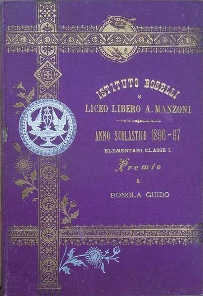 In-8° (cm 22,8x15,2), pp. VIII, 177, (7), bella legatura coeva in tela, realizzata dalla Legatoria Conti Borbone di Milano, con al piatto anteriore motivi decorativi geometrici, fitomorfi e zoomorfi e dedica "Istituto Boselli e Liceo A. Manzoni - Anno scolastico 1896-97. Elementari Classe I. Premio", impressi in oro e argento. Al piatto posteriore, al centro, stemma della Legatoria Conti Borbone, impresso a secco, entro cornice anch'essa a secco. Normali segni d'uso alla legatura, in particolare, piccola mancanza a metà, circa, della cerniera anteriore. Con molte illustrazioni in bianco e nero nel testo. Per il resto, molto ben conservato. Il volume costituì il premio per un alunno meritevole dell'Istituto Boselli di Milano, Guido Bonola.