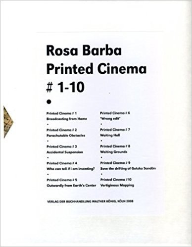 The publication project Printed Cinema continues the audiovisual work of German/Italian artist Rosa Barba, as a personal reflection on the essence of the cinematographic, wherein images are merely articulated in the space in-between images. Gaps, ellipses, dialectics between images - basically modernist notions - are essential in that respect. In Printed Cinema this is expressed in the editing principle, as well as in the oppositions between film and printing, between text and image. Apart from the specific distribution method, of course, which extends the project into a wide range of cultural and social contexts. In this way Printed Cinema challenges the outer boundaries of the artist’s book. Mechanisms appropriate to the medium of film are translated into a different context. Boxed set of 10 irregular periodical issues, published between October 2004 and November 2008 Printed Cinema # 1 Broadcasting from Home / Printed Cinema # 2 Parachutable Obstacles / Printed Cinema # 3 Accidental Suspension / Printed Cinema # 4 Who can tell if I am inventing? / Printed Cinema # 5 Outwardly from EarthÕs Center / Printed Cinema # 6 "Wrong Edit" / Printed Cinema # 7 Waiting Hall / Printed Cinema # 8 Waiting Grounds / Printed Cinema # 9 Save the drifting of Gotska Sandön / Printed Cinema # 10 Vertiginous Mapping. — pagg. 252 (10 voll.); rileg. brossura. Editore: Buchhandlung Walther König, Köln, 2008.