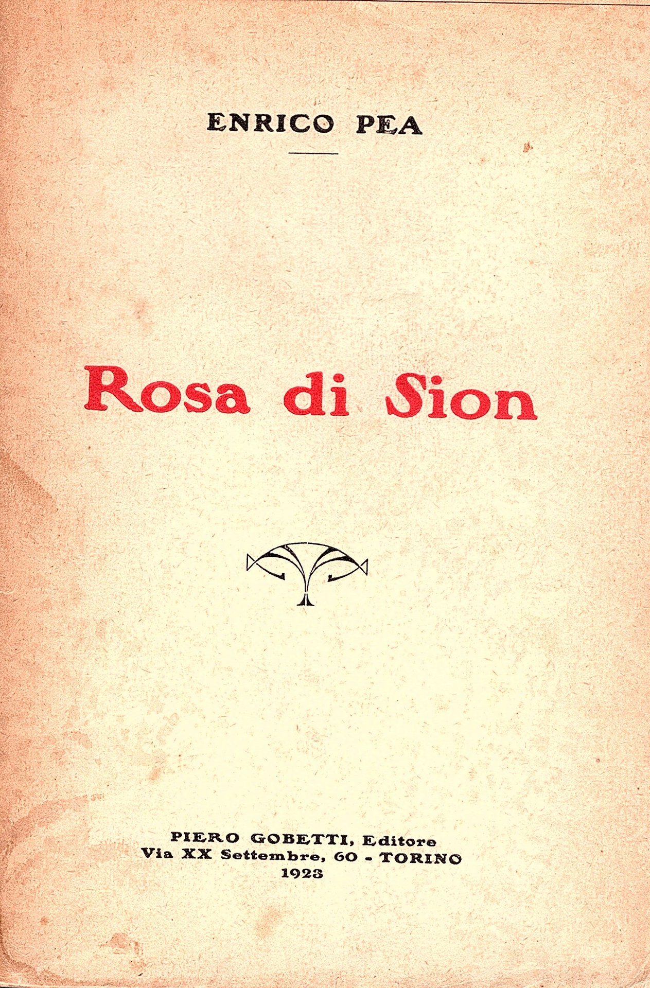 In-16° (18x12.5 cm), brossura editoriale con titoli in rosso e nero e fregio tipografico déco al piatto anteriore. Pp 46, (2). Collana Teatro, 1. Ottimo esemplare a fogli chiusi. Si acclude raro foglio volante di pubblicità editoriale. Non comune nuova edizione di questa opera teatrale del singolare scrittore lucchese Enrico Pea (1881-1958) uscita originariamente nel 1920 per i tipi napoletani della Libreria della Diana. Uno dei primi titoli delle edizioni di Piero Gobetti, non ancora assumente la consueta veste editoriale, con un saggio dell'editore sul teatro di Pea. Il dramma è un rifacimento di Sion rappresentato a Livorno il 5 gennaio 1912. Cfr. Accame Lanzillotta: 14, p. 46; Gambetti-Vezzosi: p. 666.