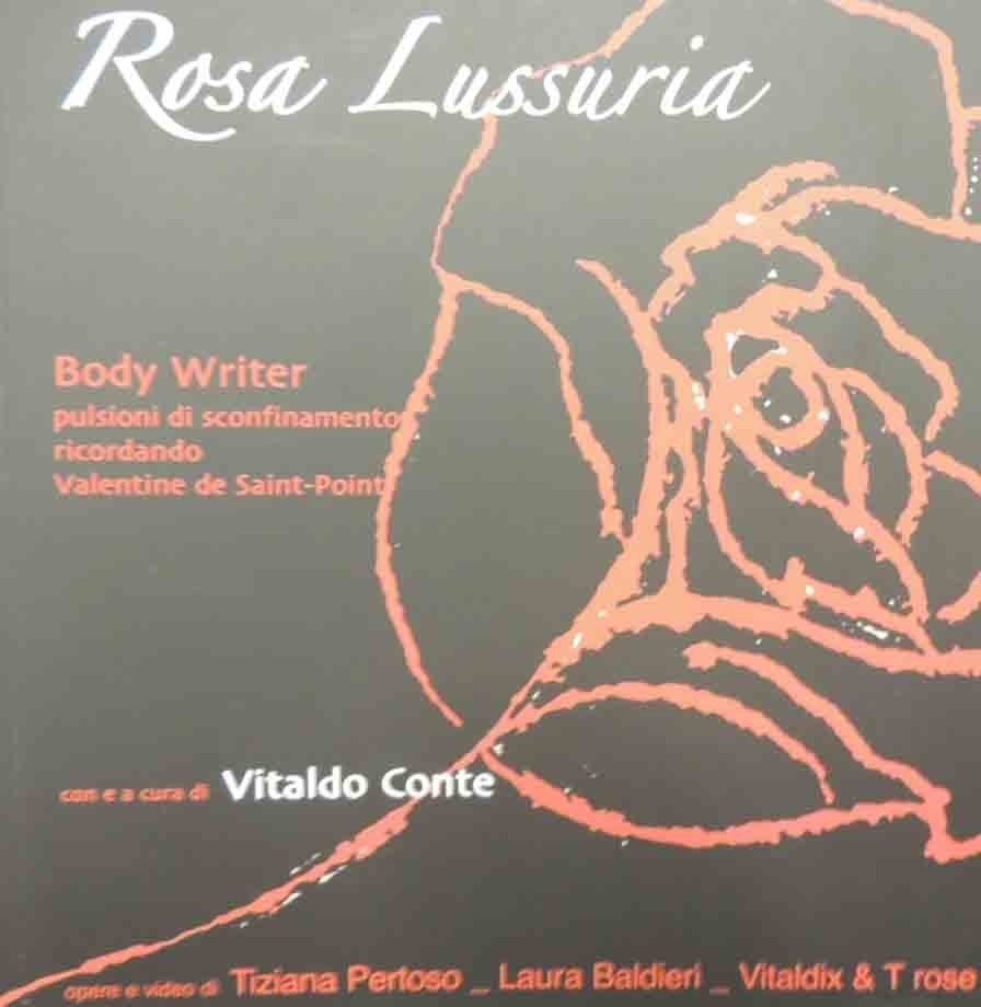 Rosa Lussuria. Body writer: pulsioni di sconfinamento ricordando Valentine De Saint-Point, con e a cura di Vitaldo Conte, opere e video di: Tiziana Pertoso, Laura Baldieri e Vitaldix e T rose, testimonianza di Carmelo Strano, Il Raggio Verde, Lecce 2009, pp. 68, ill. b.n. e col., cm 16x16, br. ed. Collana Rosa rossa, n. 4. Catalogo della mostra omonima realizzata a Lecce, presso la Biblioteca provinciale N. Bernardini, nel febbraio del 2010. Perfetto.