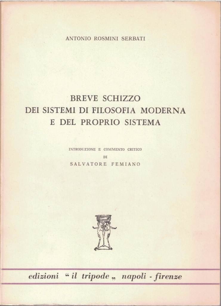 Antonio Rosmini Serbati, Breve schizzo dei sistemi di filosofia moderna e del proprio sistema. In appendice Come si possano condurre gli studi di filosofia, introduzione e commento critico di Salvatore Femiano, Edizioni Il Tripode, Napoli 1970, pp. 142, cm 21, br. ed. Collana Universitaria. Testi e studi. Numero progressivo di classificazione a margine del frontespizio. Sottolineature a lapis, lieve brunitura della carta, ma comunque buona copia, di piena fruibilità e con brossura solida e ben tenuta.