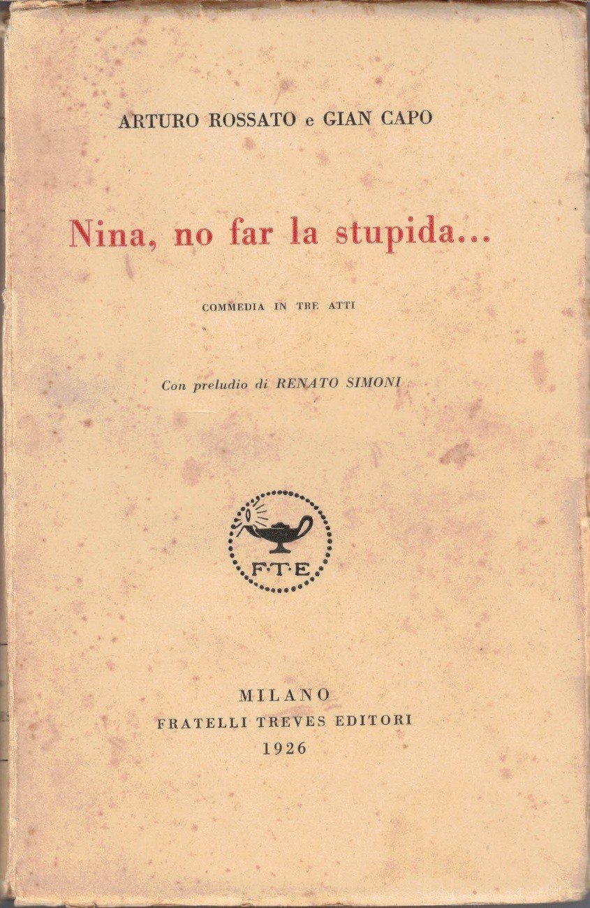Arturo Rossato, Gian Capo (Giovanni Capodivacca), Nina, no far la stupida… Commedia in tre atti, con preludio di Renato Simoni, Fratelli Treves Editori, Milano 1926, secondo migliaio, pp. XIII, 192, cm 19, br. ed. Ordinarie tracce d’uso alla brossura, minime fioriture, leggera brunitura della carta, per il resto buon esemplare, con interno ben tenuto e brossura solida.