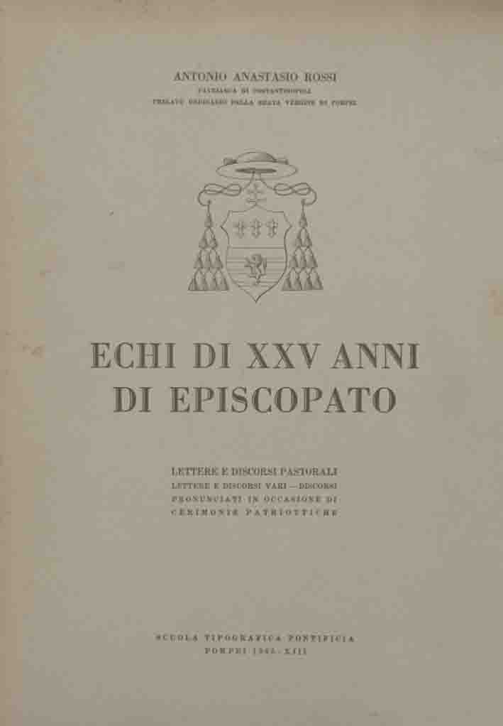 Antonio Anastasio Rossi, Echi di 25 ani di episcopato. Lettere e discorsi pastorali. Lettere e discorsi vari. Discorsi pronunciati in occasione di cerimonie patriottiche, Scuola Tipografica Pontificia per i figli dei carcerati, Pompei 1935, pp. VIII, 559, 1 c. di tav. f.t. ill. col. riportante il ritratto di don Antonio Anastasio Rossi, cm 31, br. ed. Leggere tracce d’uso alla brossura, carta lievemente brunita, per il resto ben conservato.