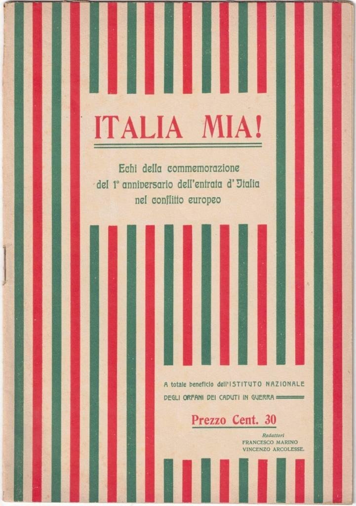 Italia mia! Echi della commemorazione del 1. anniversario dell’entrata d’Italia nel conflitto europeo, redattori Francesco Marino e Vincenzo Arcolesse, s.n., s.l. (ma stampato a Campobasso, presso la Tipografia della Casa Editrice Cav. Giov. Colitti e Figlio) s.d. (ma 1916), pp. 31, cm 24, rilegatura ed. a punto metallico. Descrizione effettuata sulla base della prima di copertina. In calce al frontespizio: A totale beneficio dell’Istituto Nazionale degli Orfani e dei Caduti in Guerra. Pubblicazione di area molisana. Raccolta di prose e poesie celebrative dell’impegno bellico italiano durante la prima guerra mondiale. Indice: Oreste Rossi, Agl’insegnanti del Molise – Francesco Marino, Perché l’Italia fa la guerra all’Austria – Momo Longarelli, Ad un orfano della nostra guerra – Giacinto de Mattia, Ai piccoli patrioti del Molise – Michele Scolpini, Ai fanciulli del Molise – Giuseppe Porzio, Voci d’anima – Francesco Mazzola, L’orfanello – Luisa Santopietro Fontana, Eroe che muore – Carolina Eliseo, Appello velato di pianto – Mena, A papà mio - Vincenzo Arcolesse, L’ultima lettera – Adalciso Amorosa, Dal vero – Virginio Alfano, Richiamato – Camillo Ruggiero, Riconoscenza – V. Z., Per l’anniversario della nostra guerra. Lievi tracce d’uso, minimi segni del tempo, per il resto ben conservato. Raro.