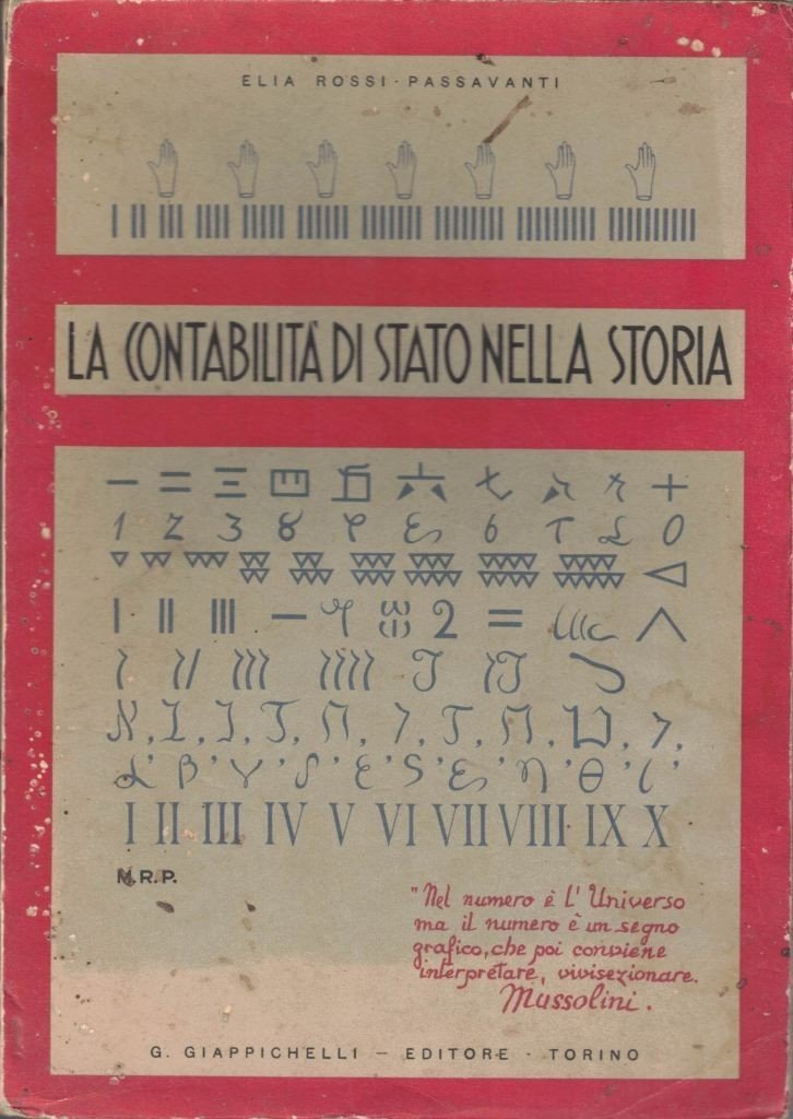 Elia Rossi Passavanti, La contabilità di Stato e l’economia di Stato nella storia, G. Giappichelli Editore, Torino 1935 XIII, pp. 335, cm 25, br. ed. Titolo alla prima di copertina: La contabilità di Stato nella storia. Tracce di vecchia gora a margine di copertina anteriore e posteriore non estesa all’interno del volume, leggere tracce d’uso alla brossura, minime fioriture, per il resto e nel complesso buona copia. Intonso.