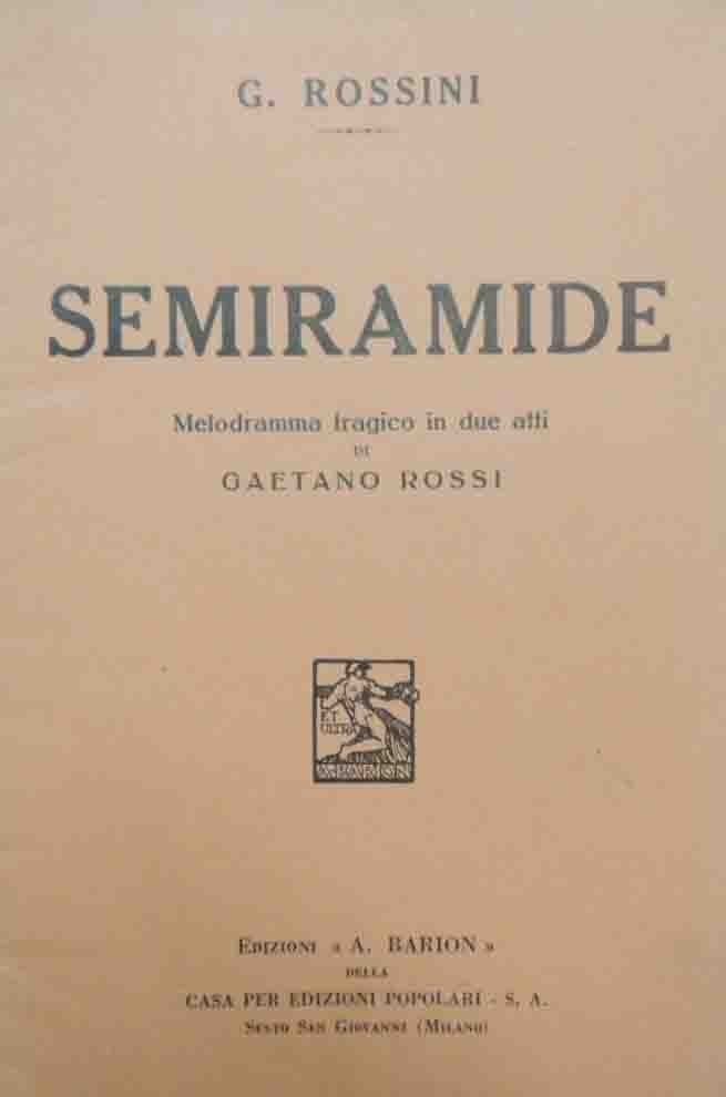 Semiramide. Melodramma tragico in due atti di Gaetano Rossi, musica di Gioacchino Rossini, Edizioni A. Barion della Casa per Edizioni Popolari S. A., Sesto San Giovanni (Milano) 1933, pp. 32, cm 18, opuscolo spillato. Minime tracce d’uso, lieve brunitura della carta, per il resto ben conservato.
